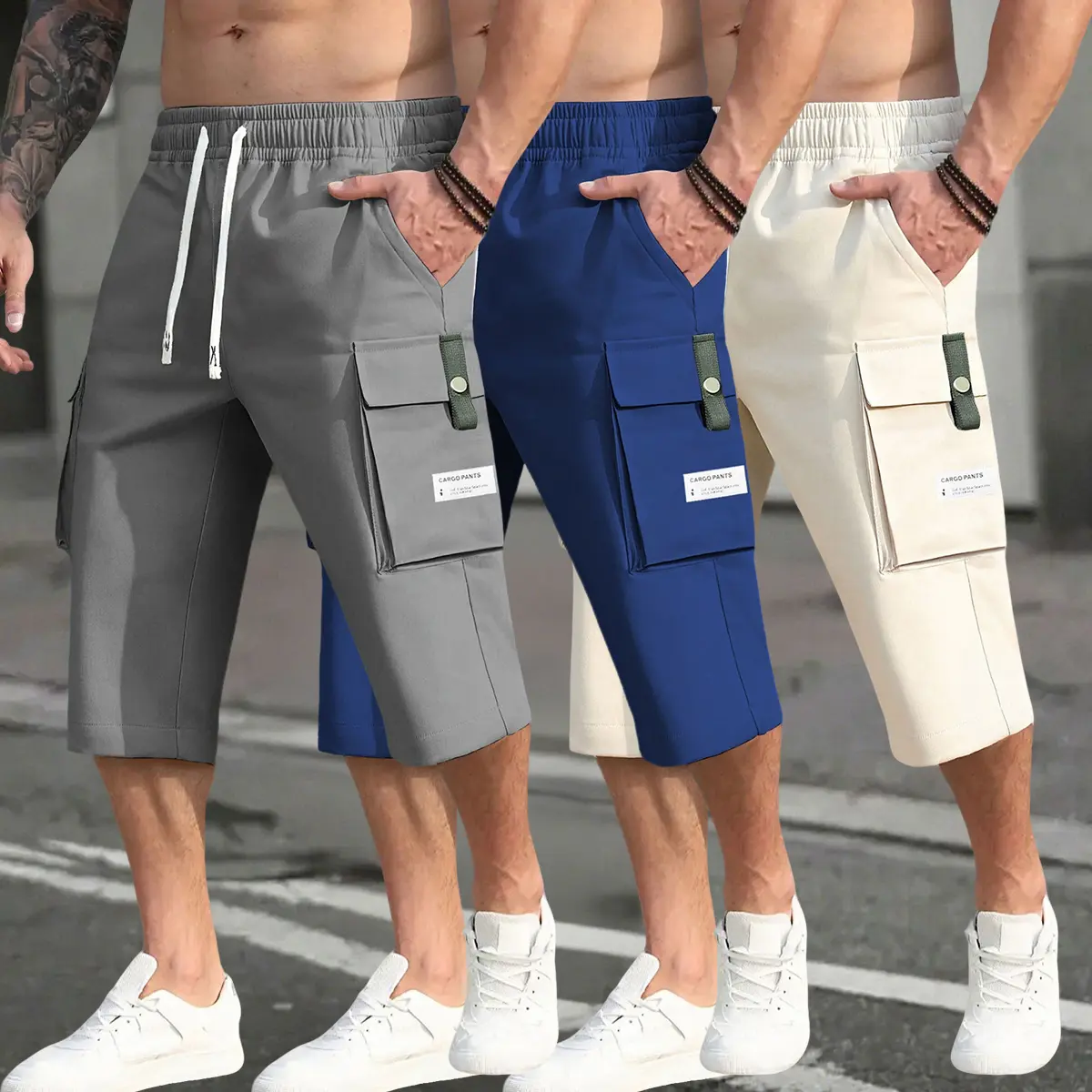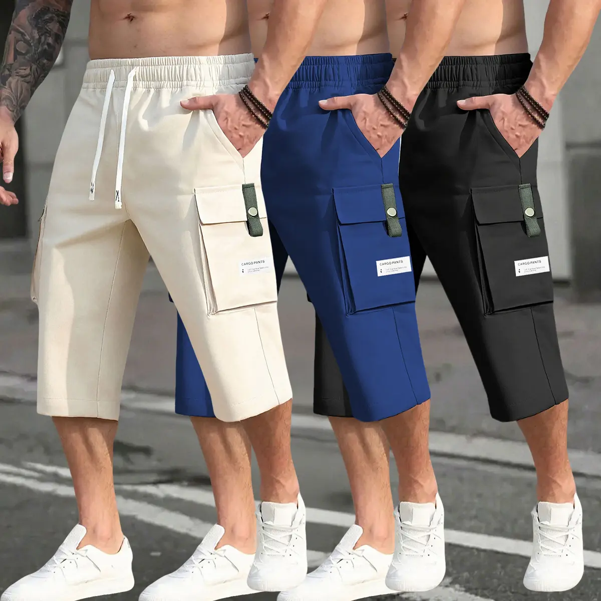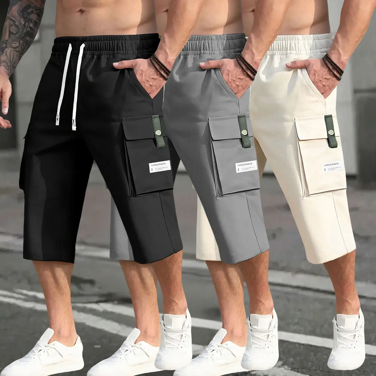 Men’s 3-piece cargo pants set featuring a drawstring waist, large pockets, and letter patches—fashionable and casual, suitable for summer wear