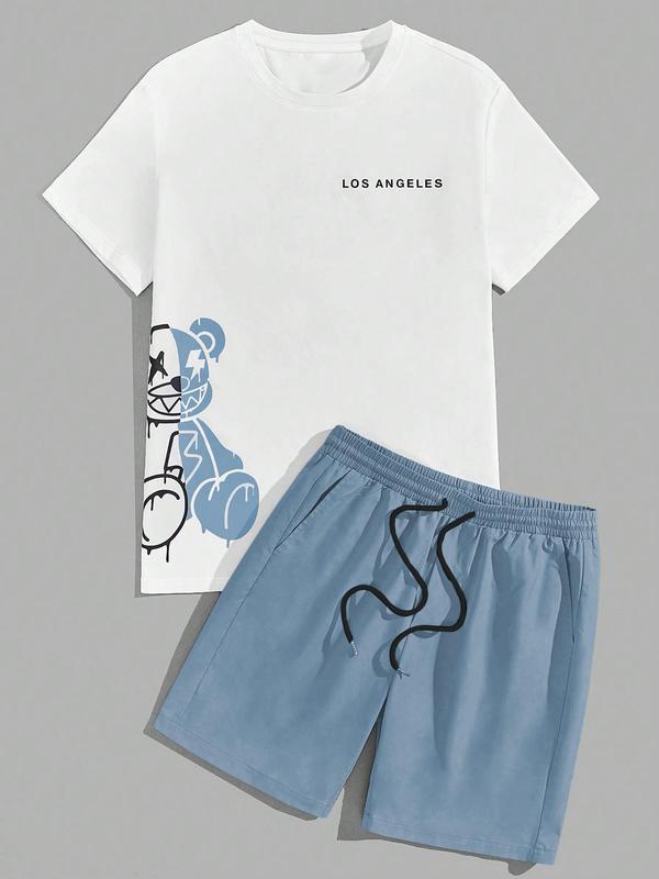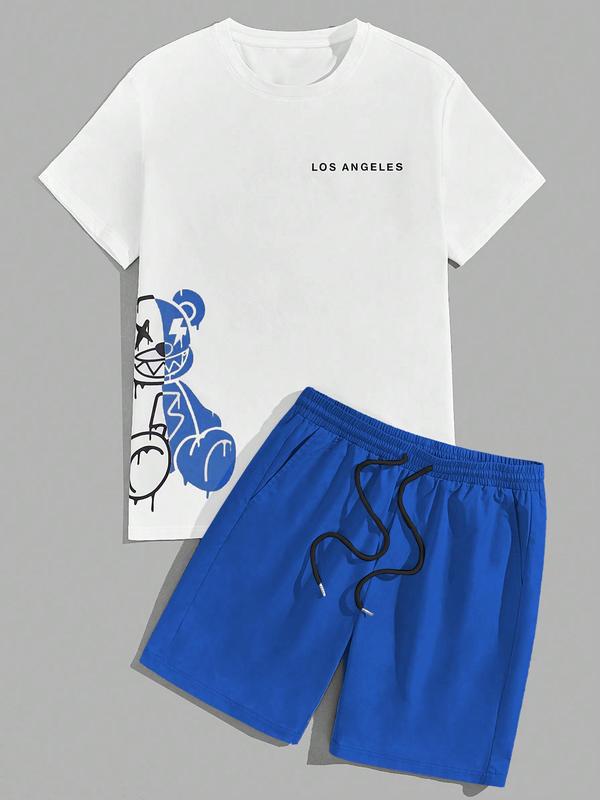 5. Two-Piece Set Men's Cartoon Bear & Letter Print Short Sleeve Tee & Shorts Set, Regular Fit Casual Round Neck T-shirt & Track Shorts, Summer Clothes Set for Men
