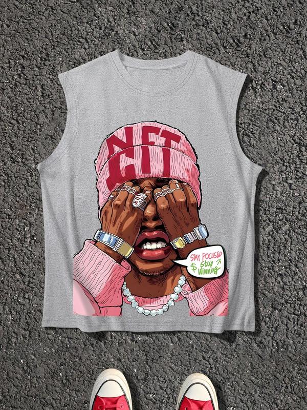 Men's Cartoon Face Print Tank Top, Loose Casual Sleeveless Round Neck Vest for Summer, Men's Top for Daily Wear, Socks