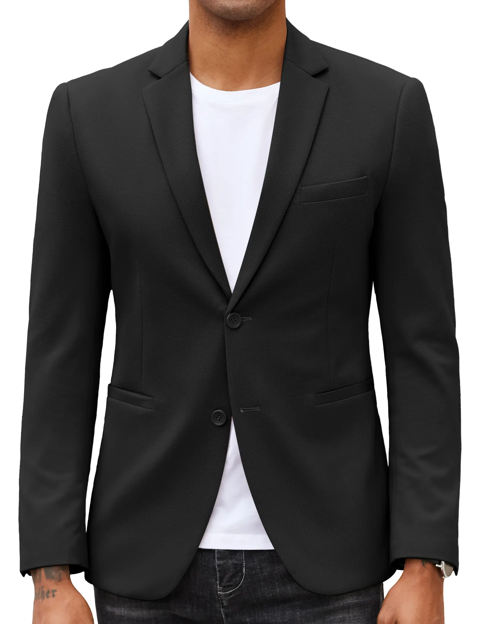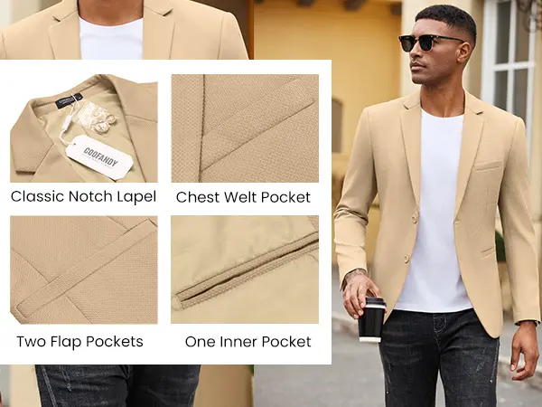 ·ABOUT POCKETS: This mens suit jacket includs two welt pockets and one side pocket for convenient storage. One welt pocket at chest for your pocket square. All pockets are real and available. The fashion pockets are sewn on by thread when you received it, and you need to cut it open with a scissors or sharp object.