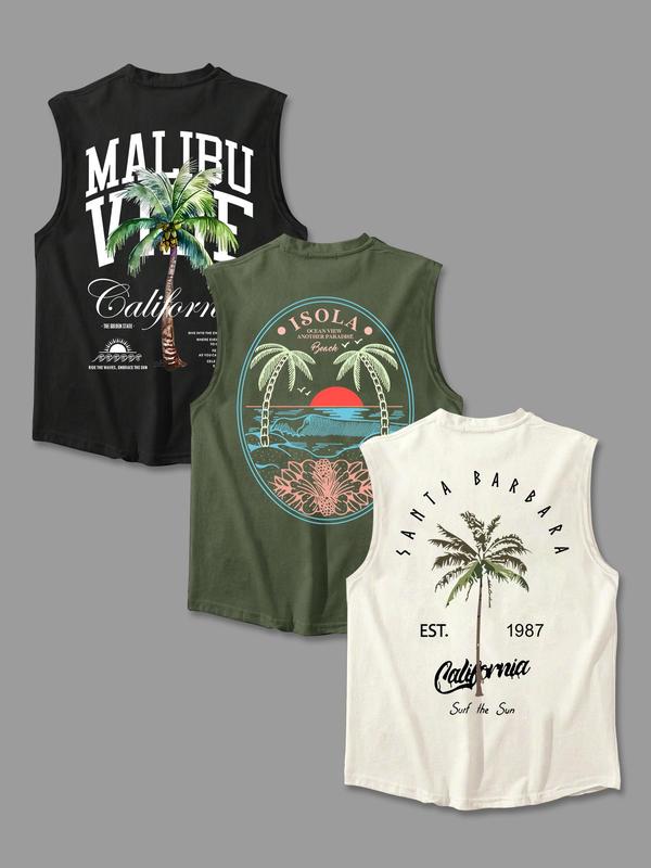 5. Men's Letter & Palm Tree Print Round Neck Tank Top, Regular Fit Casual Graphic Sleeveless Vest for Summer, Men's Top for Daily Wear, Menswear, Tank Tops Workout