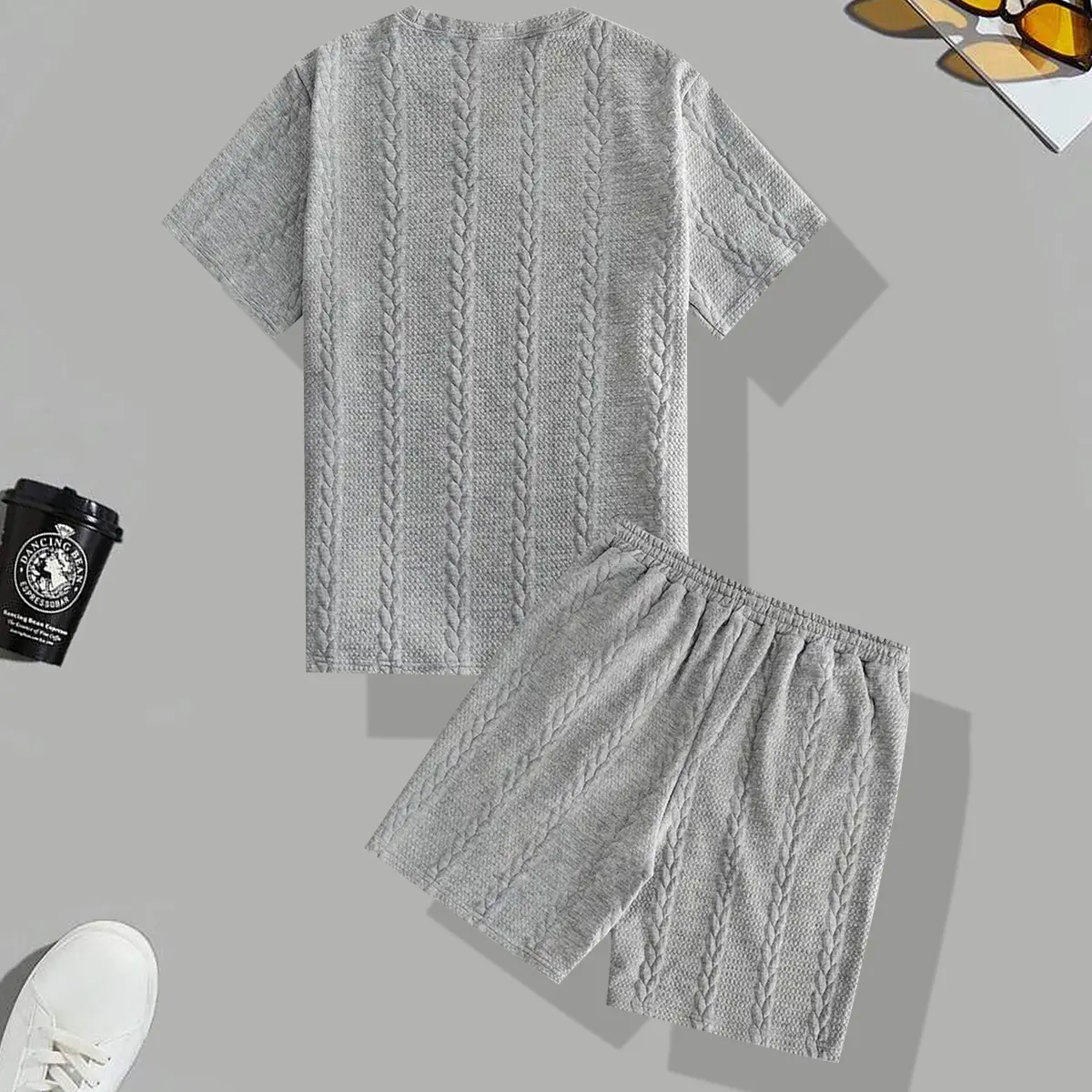 5. Men's Casual Jacquard Short Sleeve Set, Men's Short Sleeve Outfit, Suitable for Casual Wear and Vacation