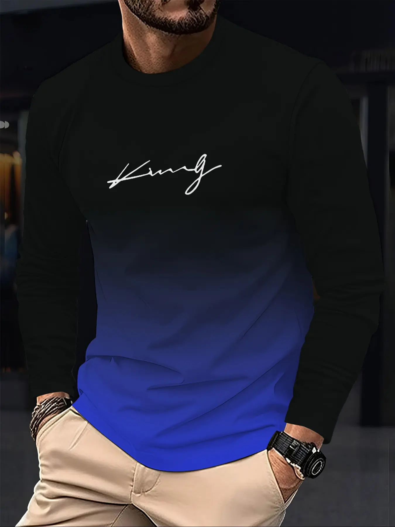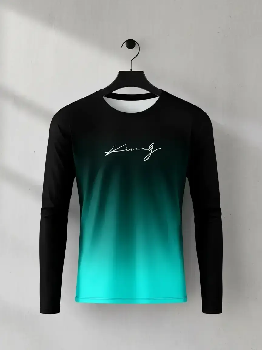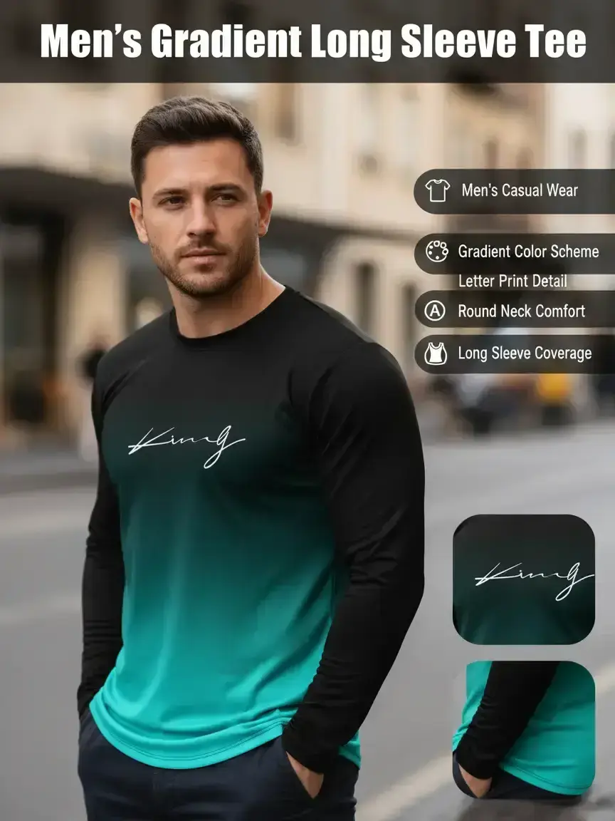 Men's Casual Long Sleeve Fitted T-Shirt, Gradient Color, Polyester Material, Round Neck, Letter Print Design