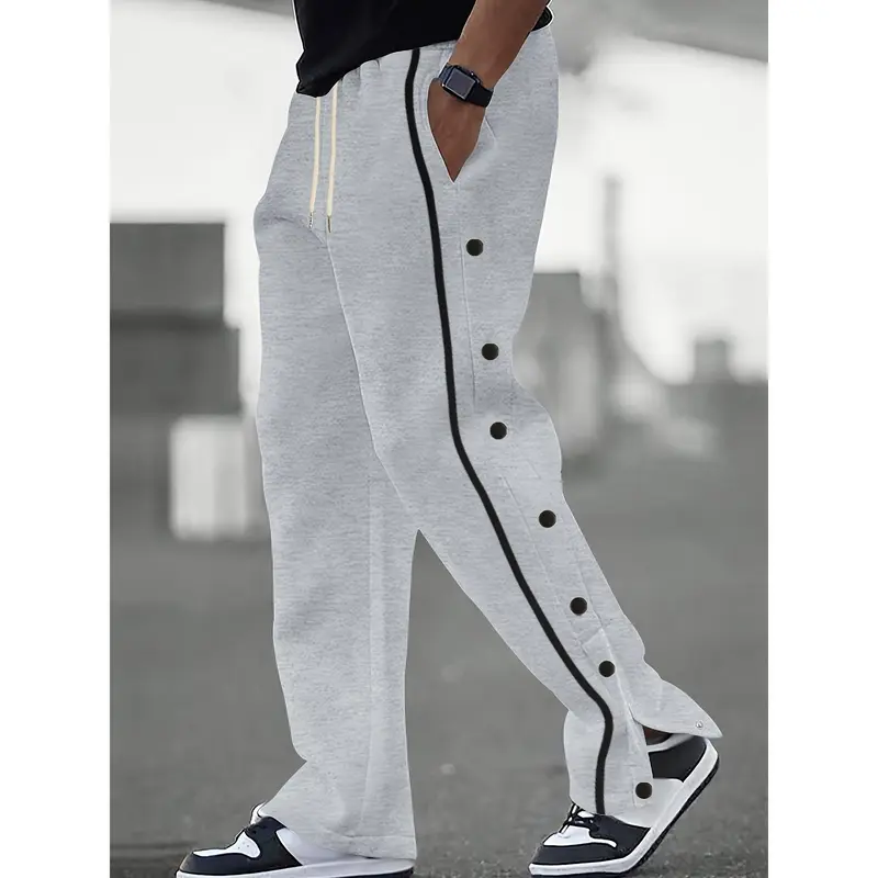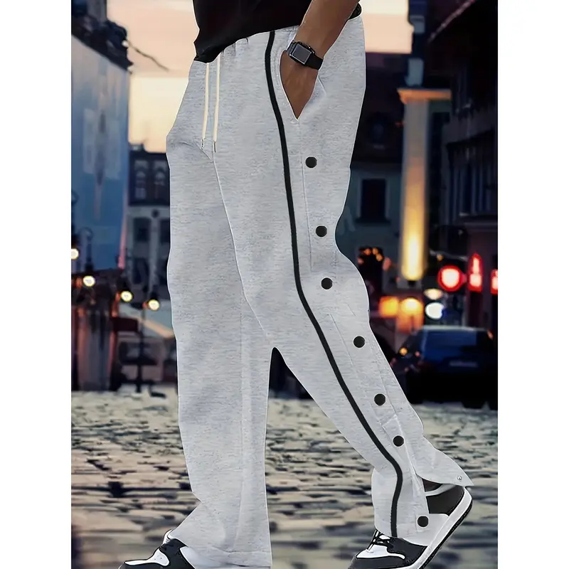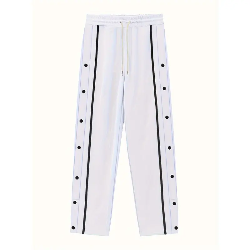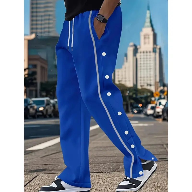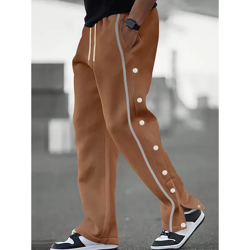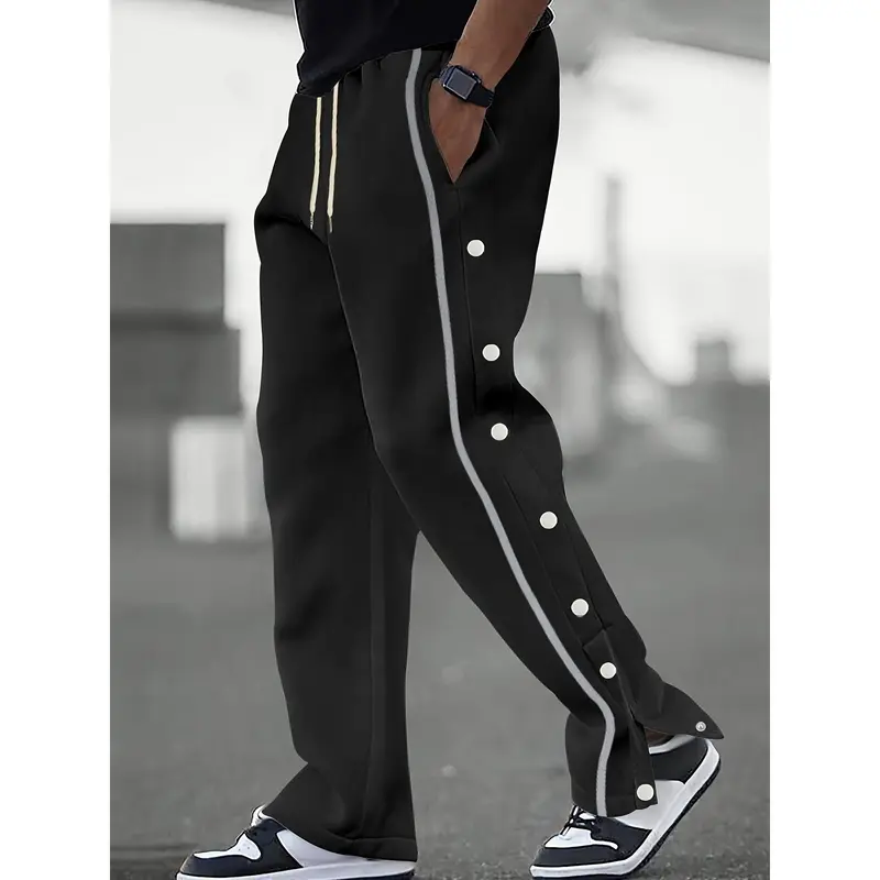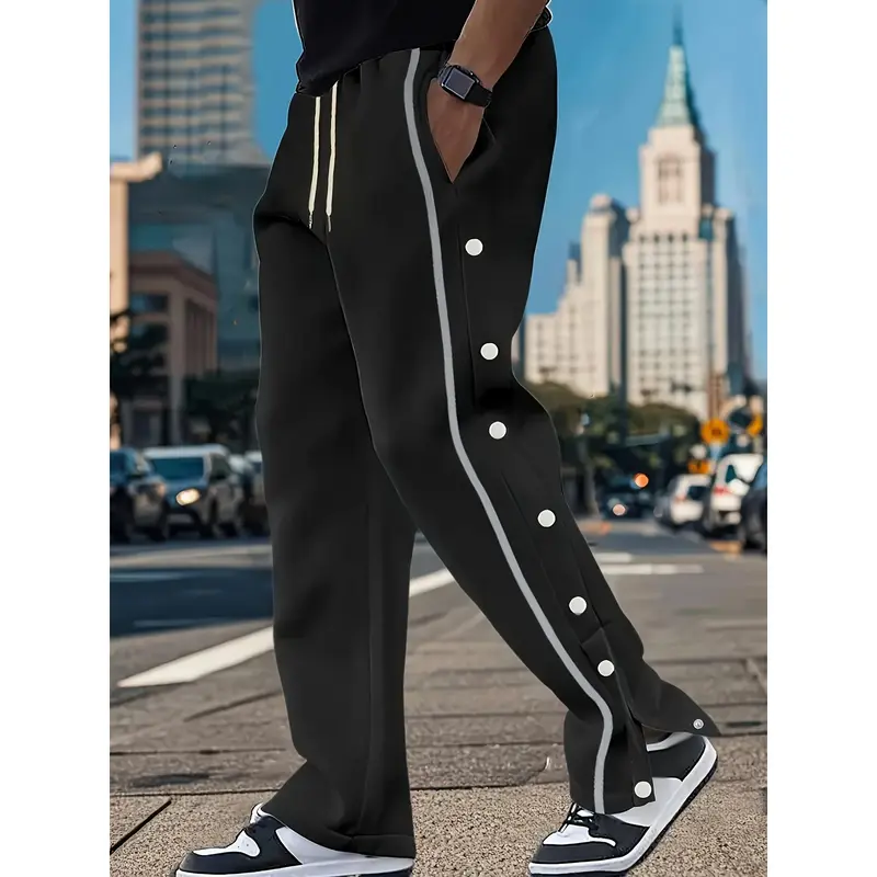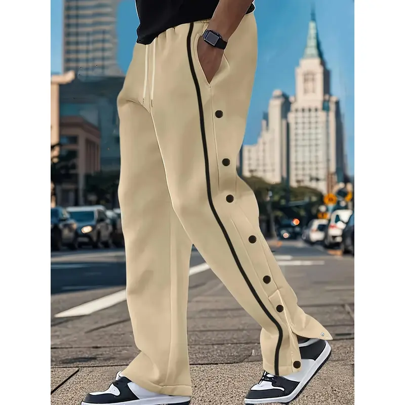 Men's Casual Polyester Pants, Solid Color, Side Stripes and Button Details, Regular Fit, Drawstring, Suitable for All Seasons, Comfortable and Fashionable for Adults