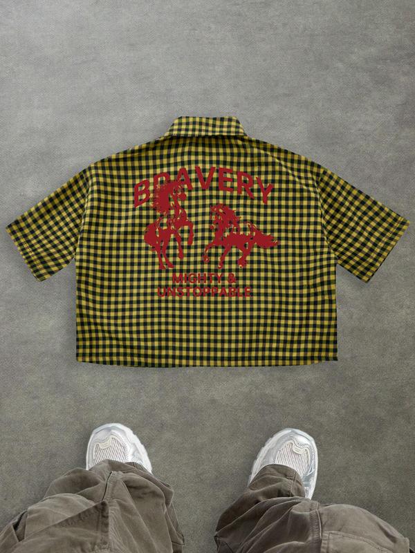 5. Men's Regular Fit Horse & Letter Print Short Sleeve Shirt, Casual Retro Gingham Shirt for Daily Wear, Fashion Men's Top for Summer