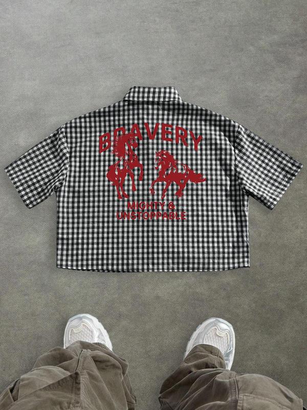Men's Regular Fit Horse & Letter Print Short Sleeve Shirt, Casual Retro Gingham Shirt for Daily Wear, Fashion Men's Top for Summer