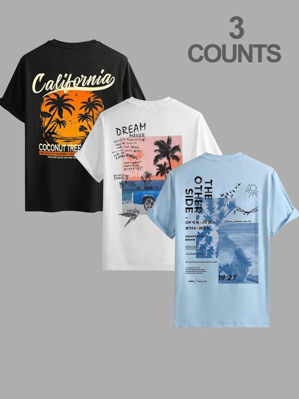 5. Men's Letter & Coconut Tree Print Round Neck Tee, Regular Fit Casual Short Sleeve T-shirt for Summer, Men's Top for Daily Wear