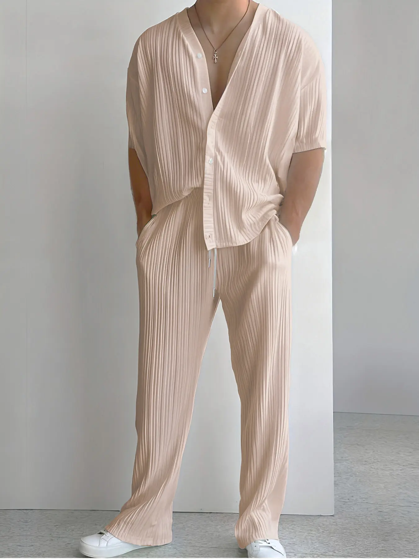 5. Men's Beige Textured 2Piece Casual Set, Loungewear - Short-Sleeve V-Neck Cardigan (with Vertical Pleats & Button Closure) + Matching Drawstring Pants (Coordinating Pleated Fabric), Oversized Fit, Ideal for Summer Daily Casual, Café Lounging & Weekend Out