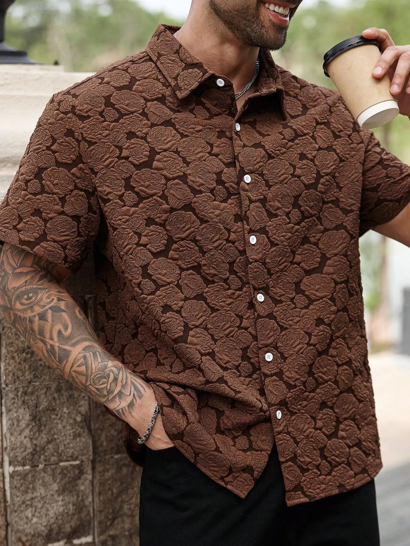 Men's Casual Short Sleeve Shirt with Rose Pattern, Casual Party Shirt, Retro Luxe Textured Coffee Shirt for All Seasons, Casual Stylish Menswear, Great Gift for Boyfriends