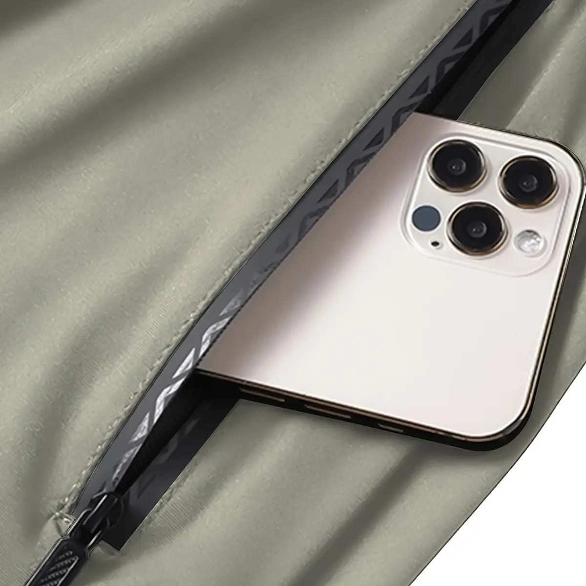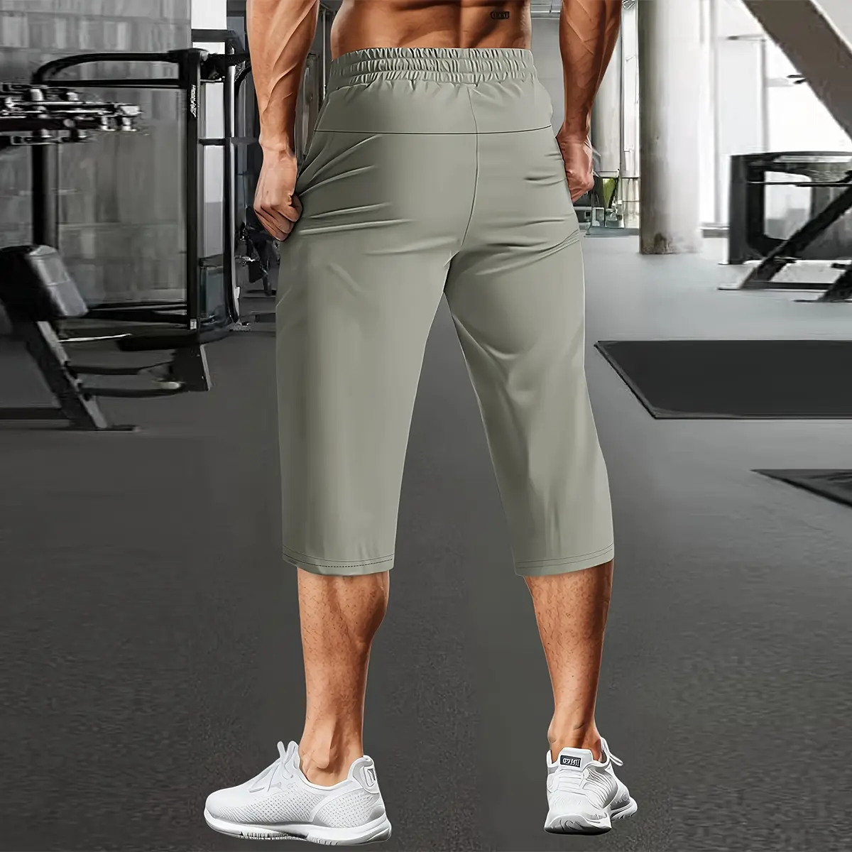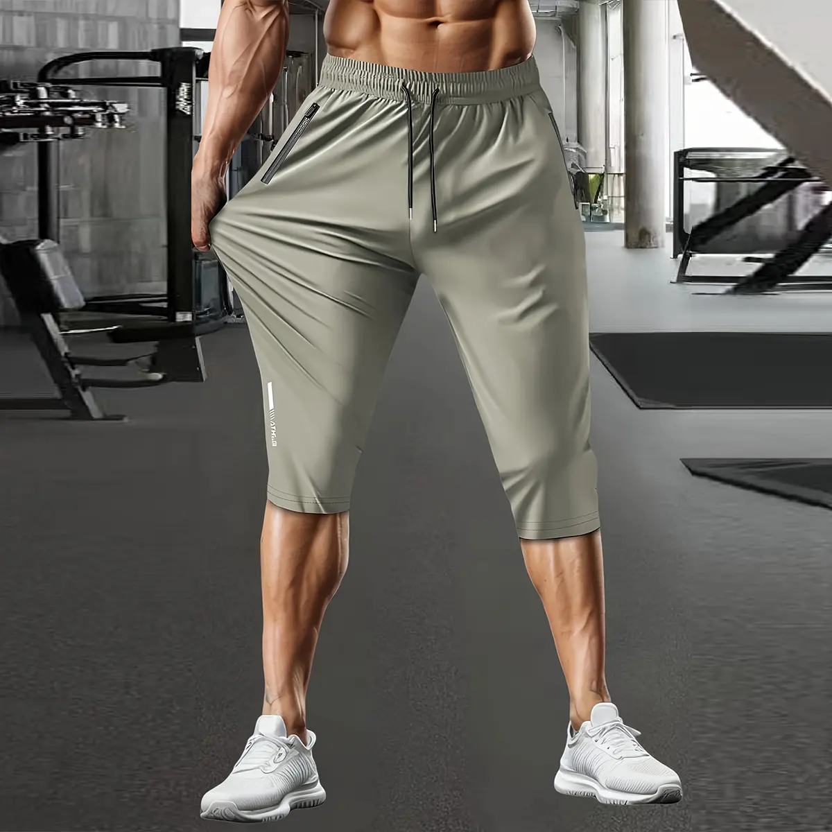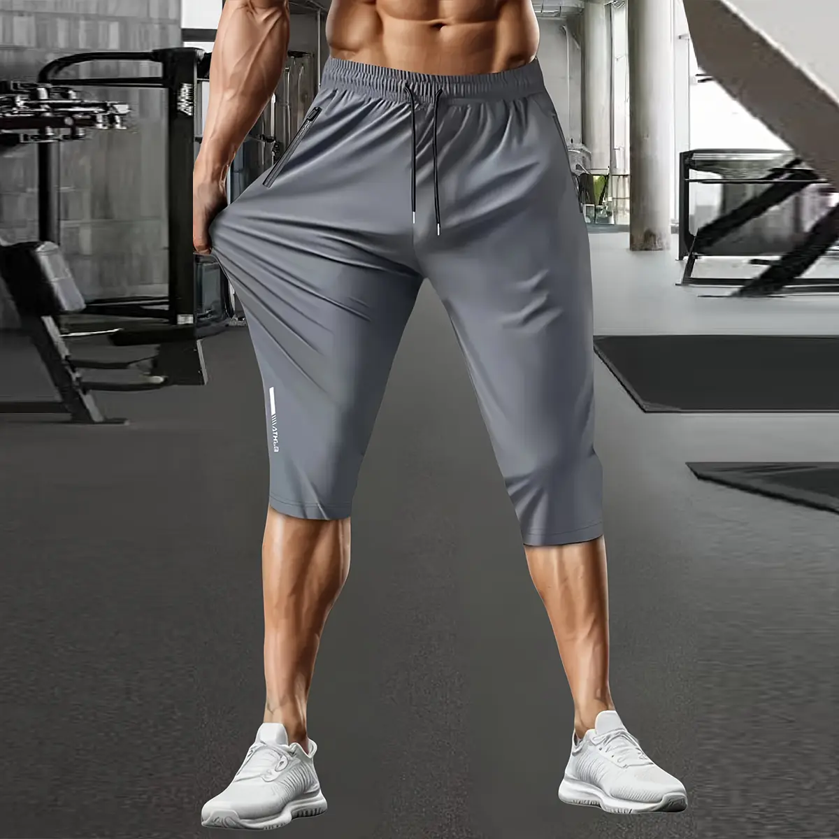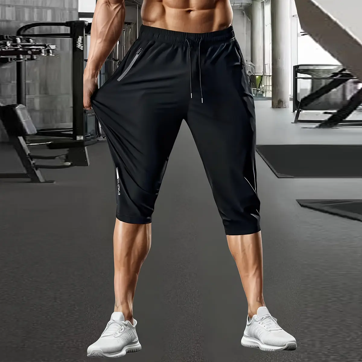 Men's casual stretchable ice silk fabric breathable waist drawstring, zipper pocket fashion sports capri pants with reflective print. Basic comfortable quick-drying breathable outdoor running, cycling, training and sports capri pants.