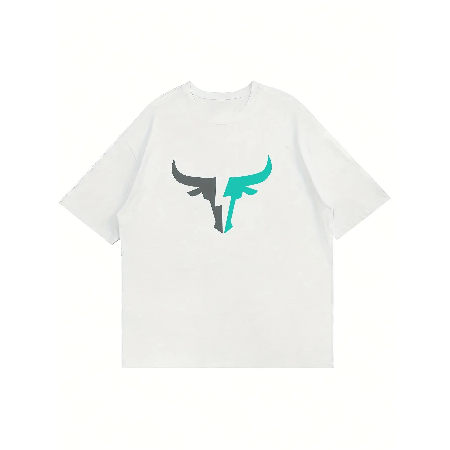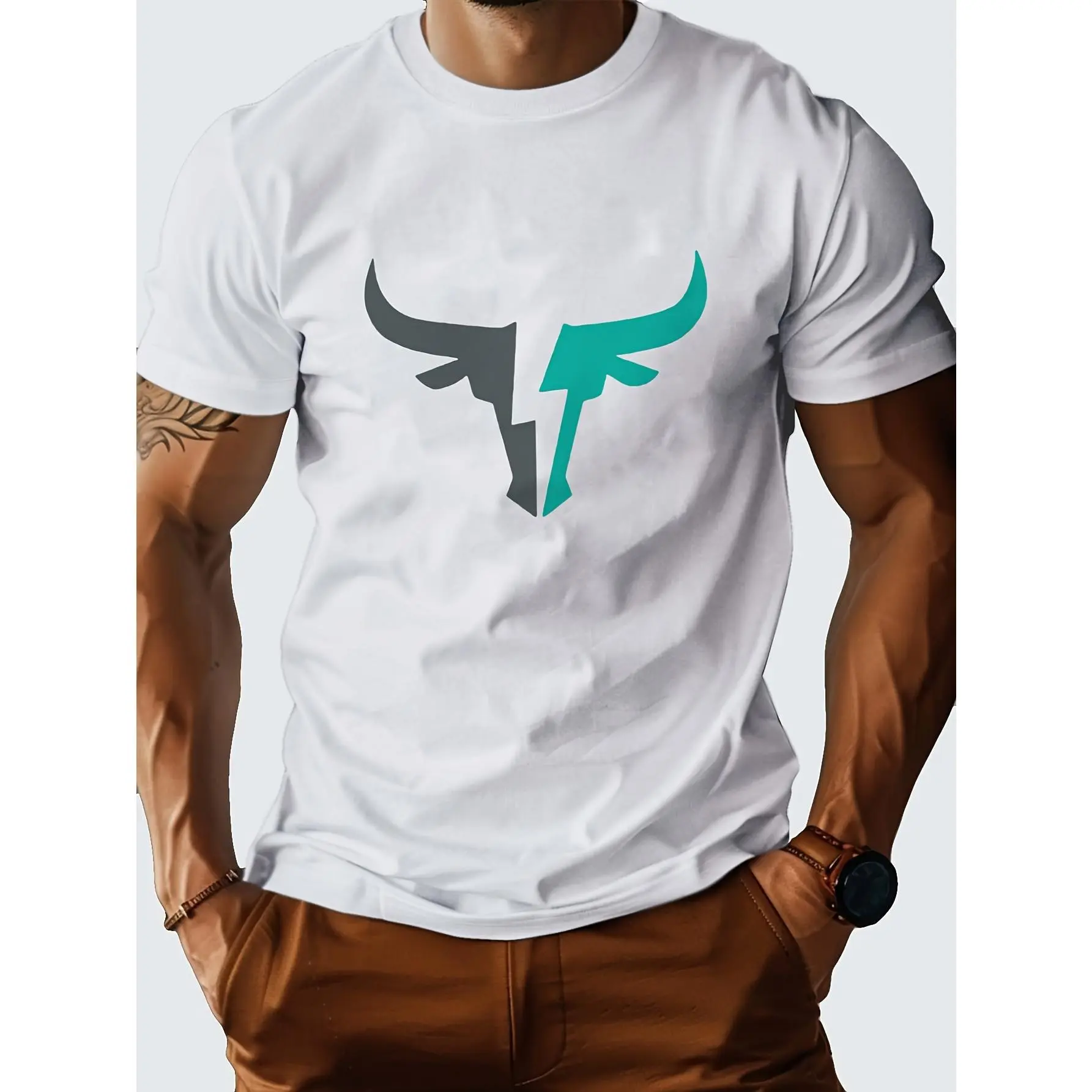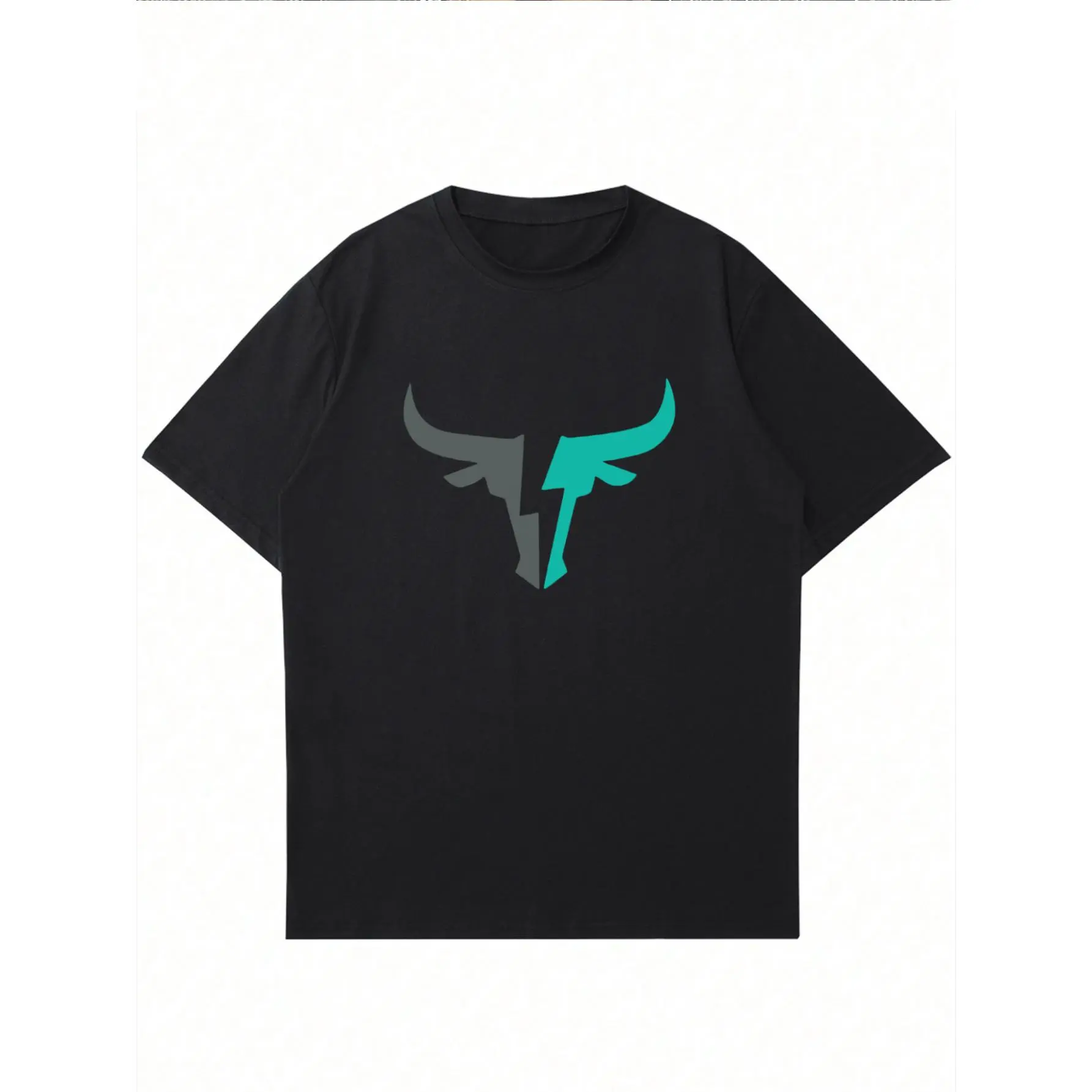 5. Men's Casual Short Sleeve Crew Neck T-Shirt with Bull Head Graphic - Black with Teal Geometric Design, Lightweight Polyester Blend, Perfect for Summer, Outdoor & Home Wear, Casual Summer Wear | Bull Head Design | Smooth Fabric