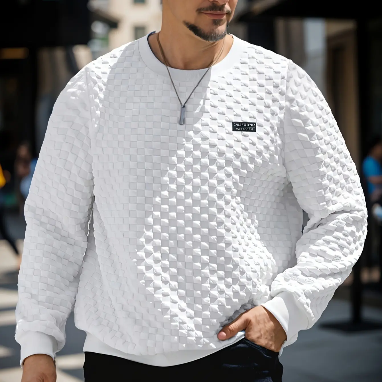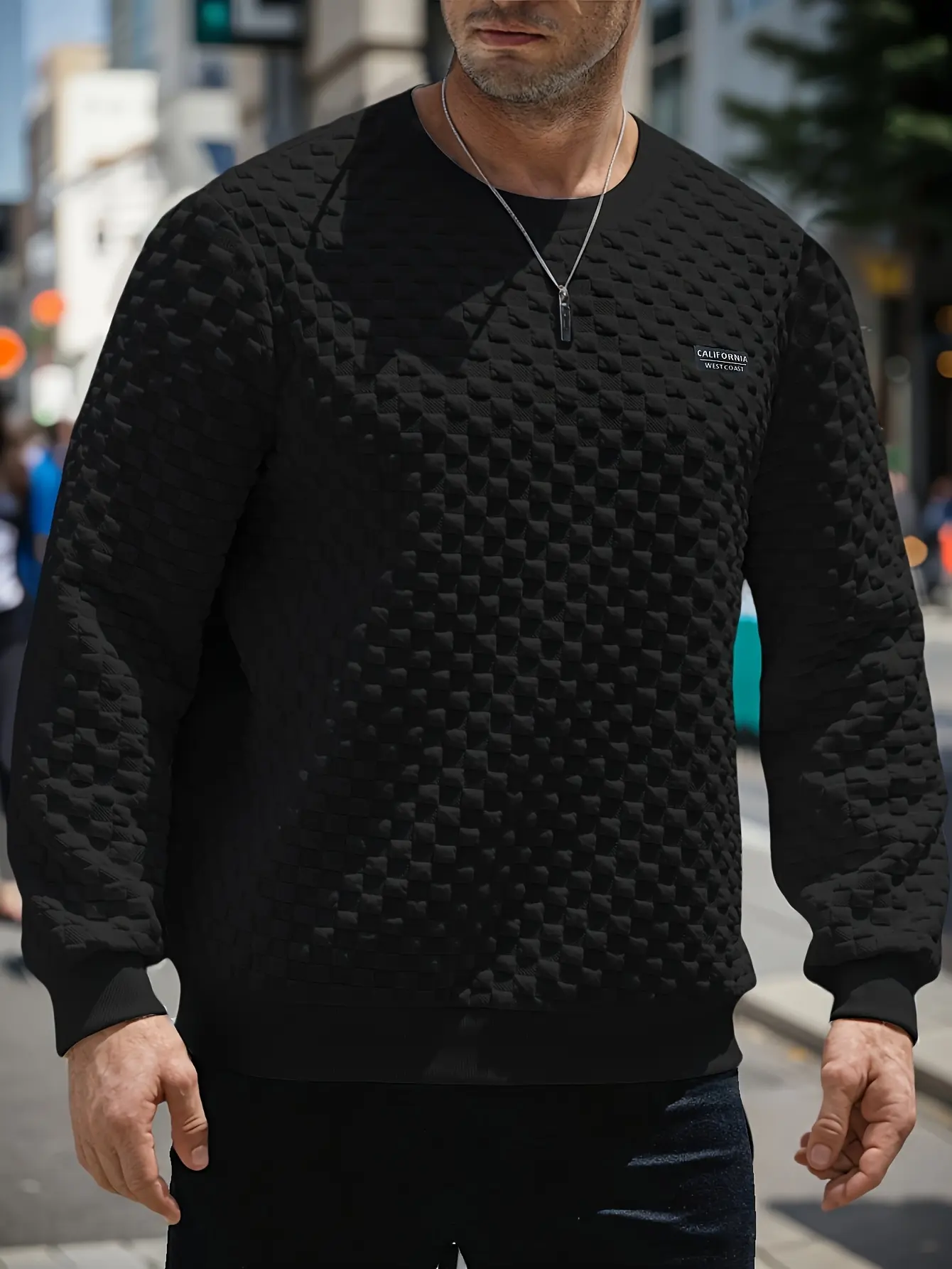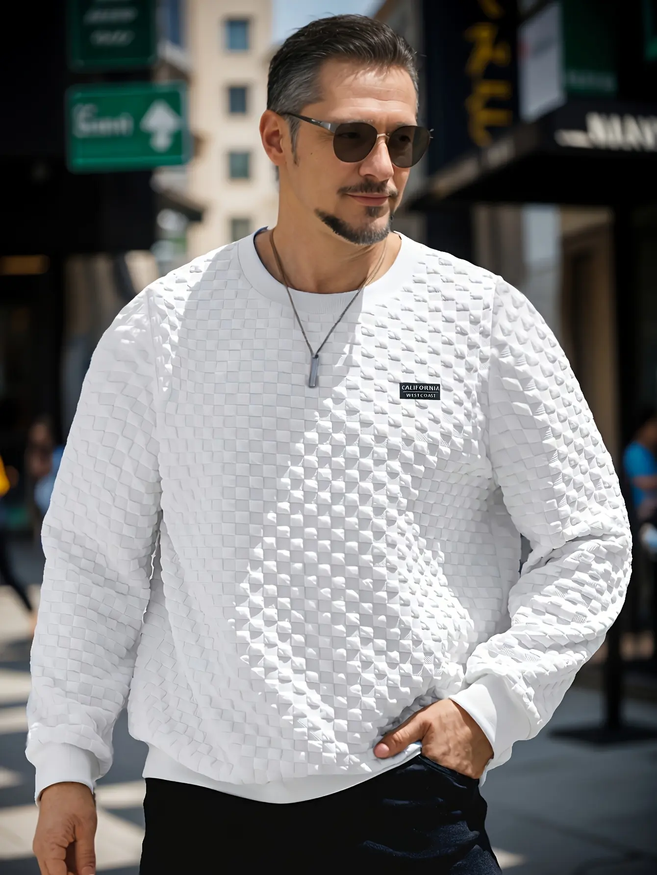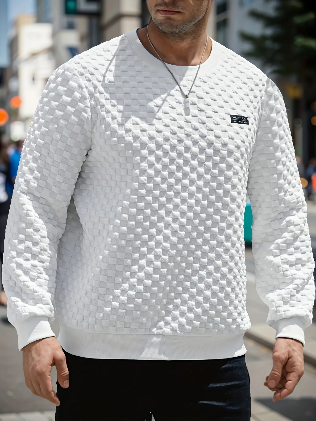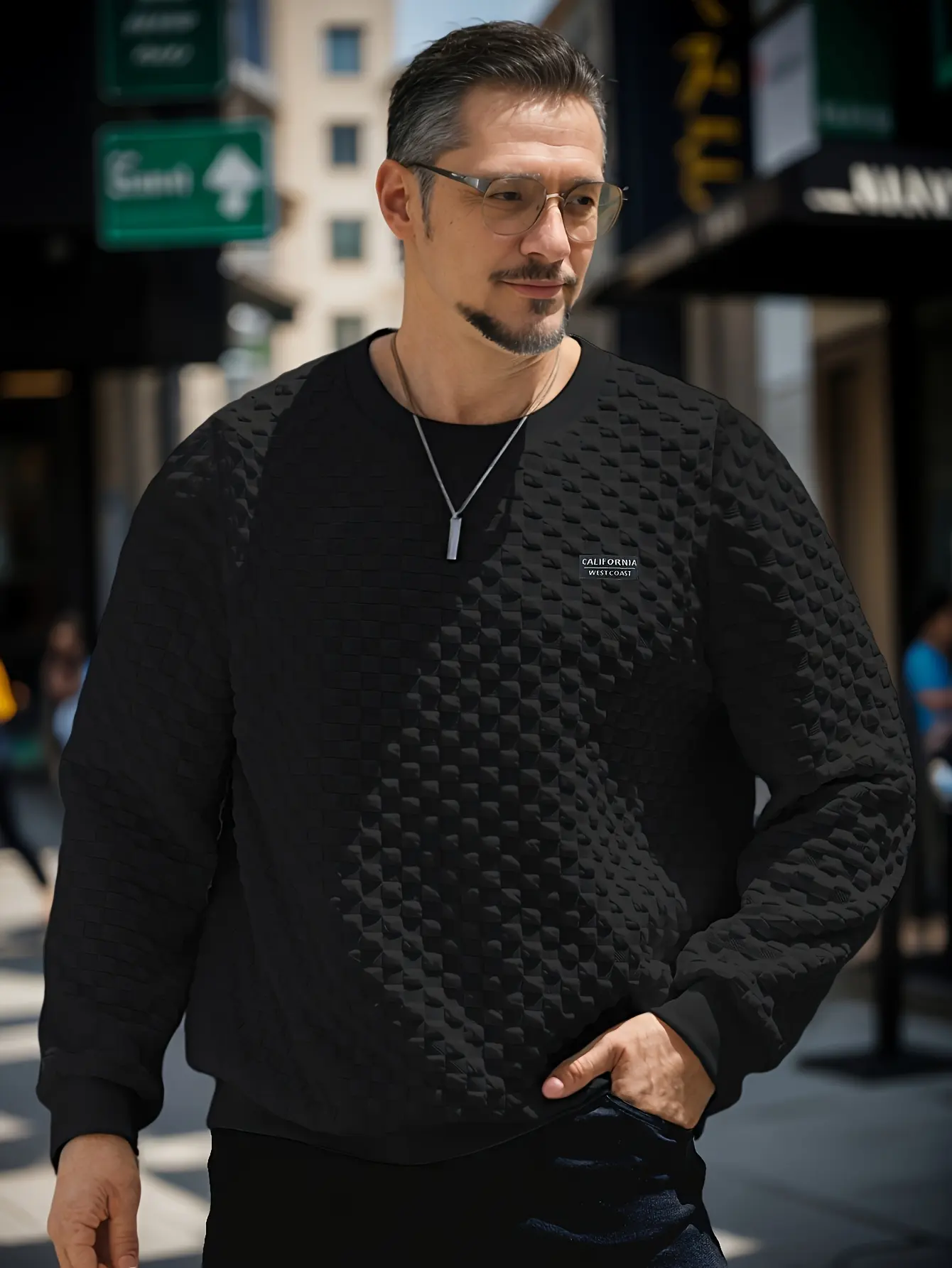 Men's fashionable checkered pattern long sleeved round neck sports shirt, made of 100% polyester knitted fabric, casual regular style, moderate elasticity, solid color cut with printed details, weighing 8.47 ounces per square meter. X