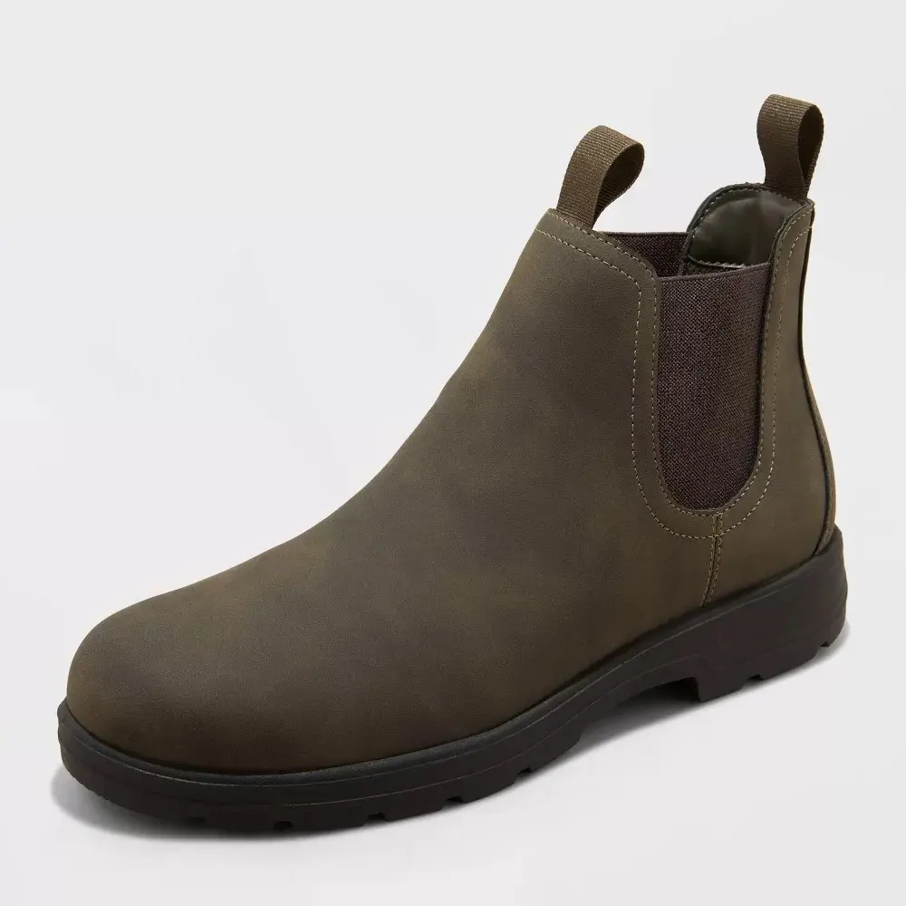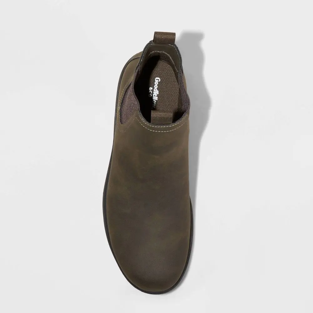 These Huxley Chelsea Boots from Goodfellow & Co are a perfect addition to your shoe wardrobe. The faux-leather design features a solid-color upper with a round closed toe, cushioned insole and medium width. Set on a TPR outsole, these mid-calf boots are equipped with distinct elastic panels on the sides, along with front and back pull tabs for a snug, secure fit. Experiment with different clothing combinations to showcase your unique style and make these Chelsea boots a versatile staple in your collection.
