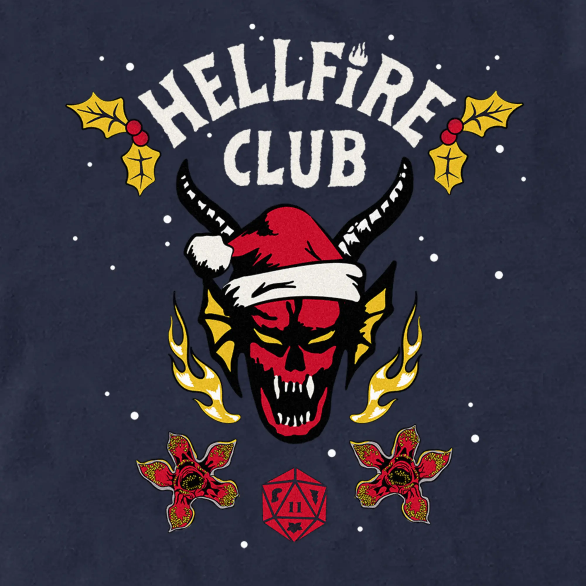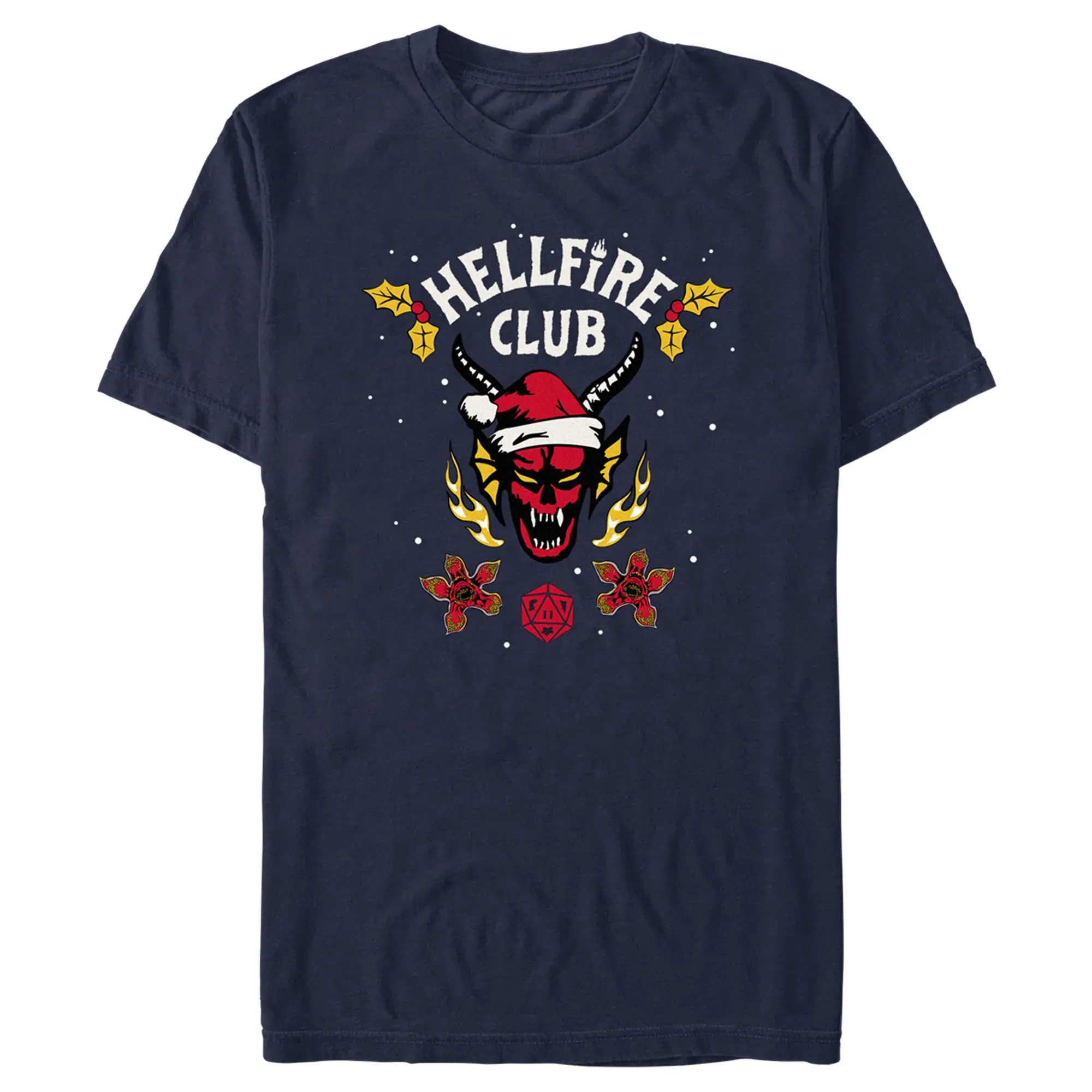 Strut your stuff with this stylish new men's t-shirt that is perfect for the holidays! Featuring the iconic Hellfire Club logo dressed up as Santa surrounded by dice, fire, hollies, and demogorgons across the front.
