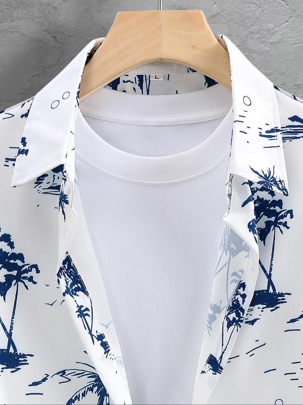 Men's Coconut Tree Print Shirt & Shorts Set, Regular Fit Casual Short Sleeve Button Up Top & Drawstring Waist Shorts, Men's Summer Outfits