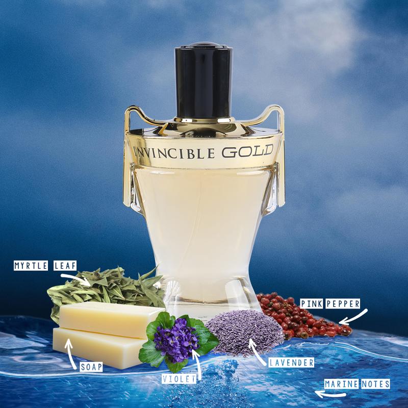 Invincible Gold Eau de Toilette offers a musky, aromatic, marine, and woody scent profile.