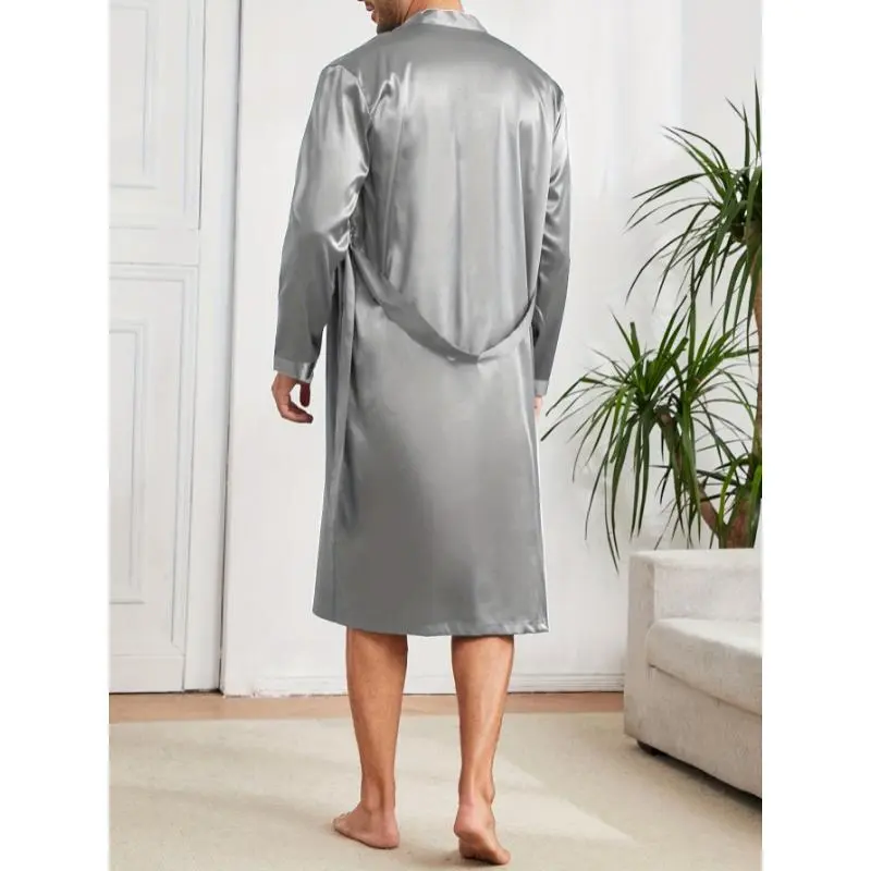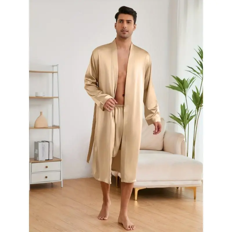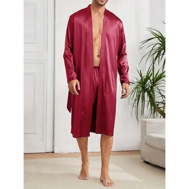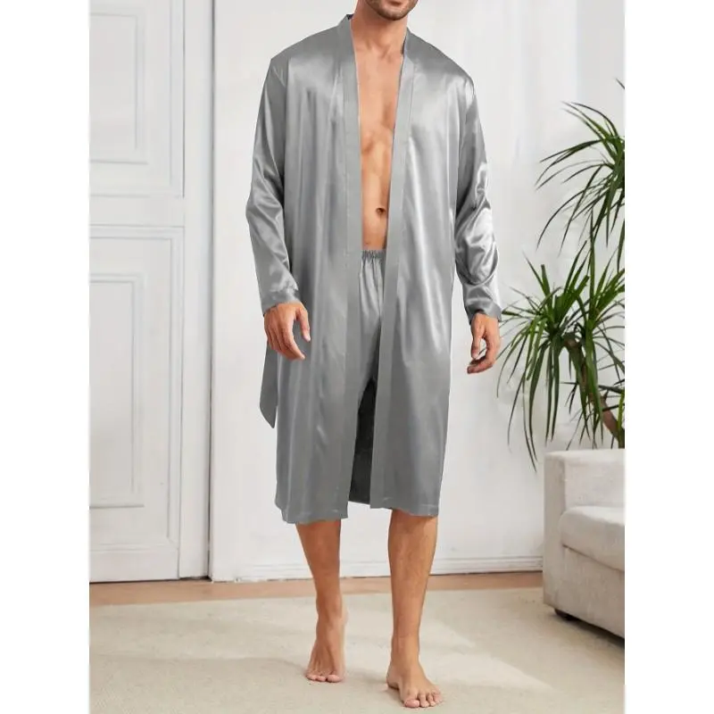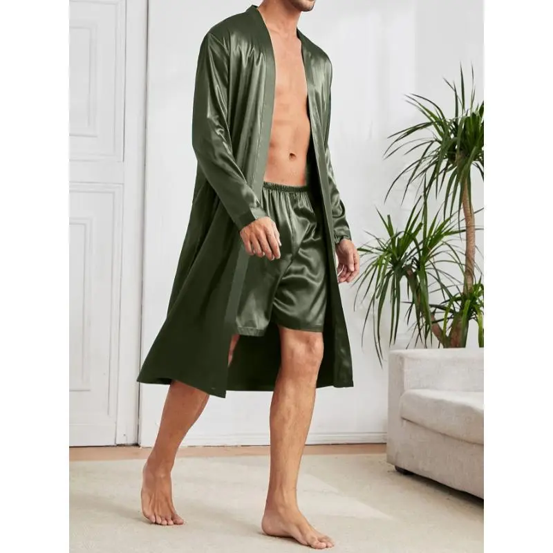 5. Men's Simple Style Casual Pajamas Sets, Men's Comfy Solid Robe, Elegant Lace Up Robe & Loose Shorts Home Pajamas Setswomen's clothing