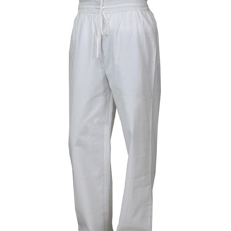 White pants for Men great for wearing with Kurti's or Dishdashs Draw string waist for comfort Fabric 100% cotton Machine wasable in cold with like colors tumble dry do not heat