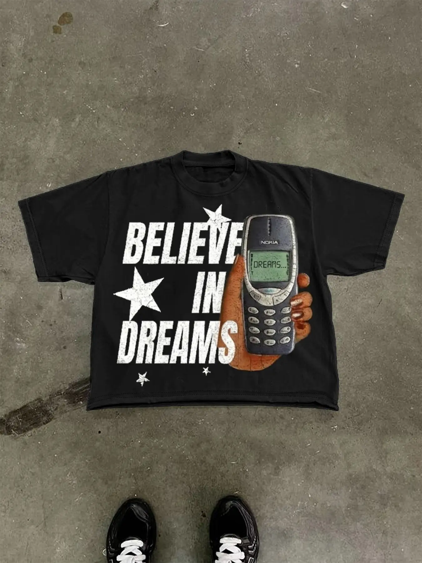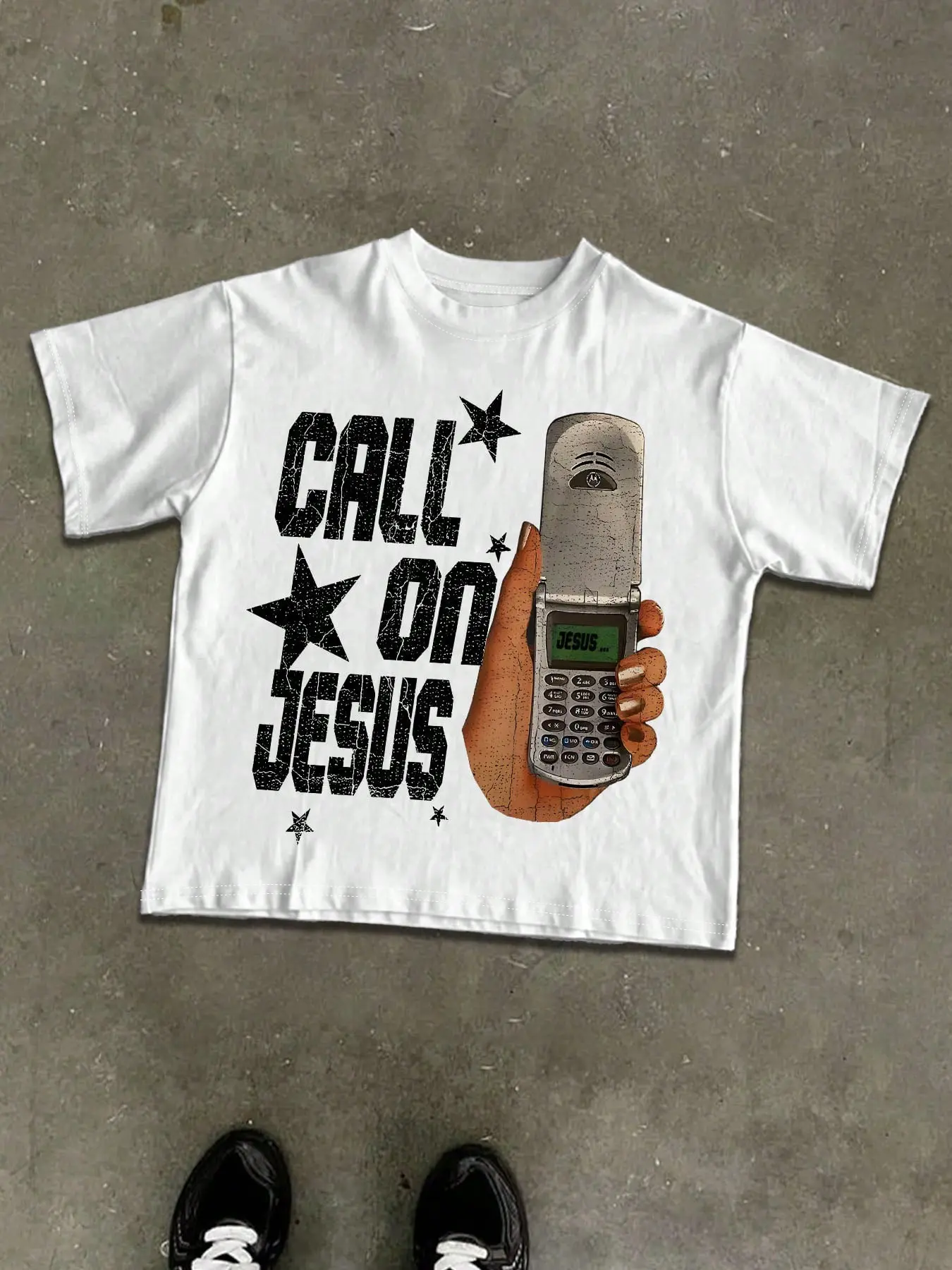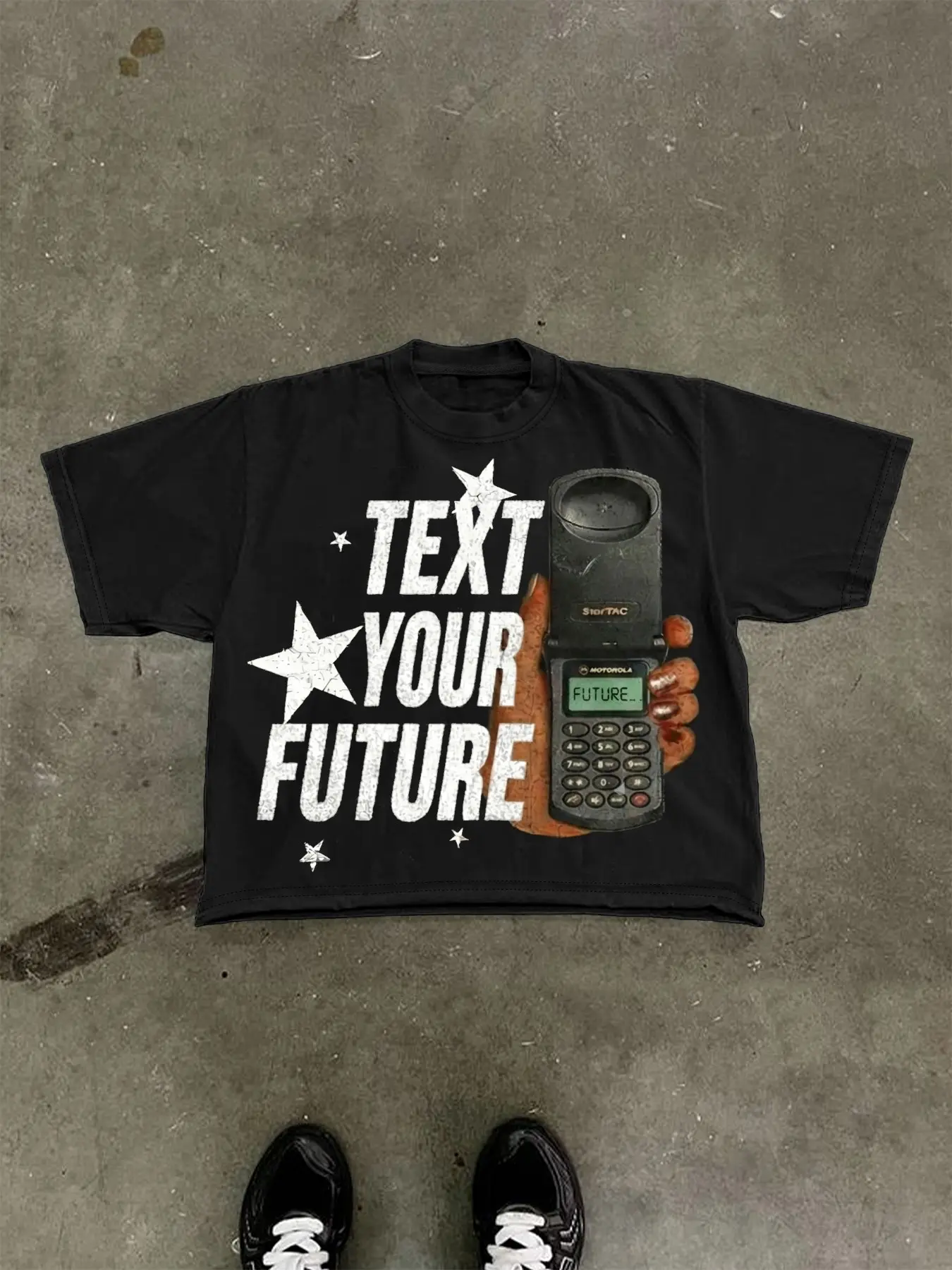 only photo I have is of me and my bf so sorry about that ,the shirt did take a little big longer then expected to arrive however I was not disappointed when it arrived. It’s not cheaply printed on the shirt it feels nice and it’s like a box cropped shirt which I really enjoy for my style:)