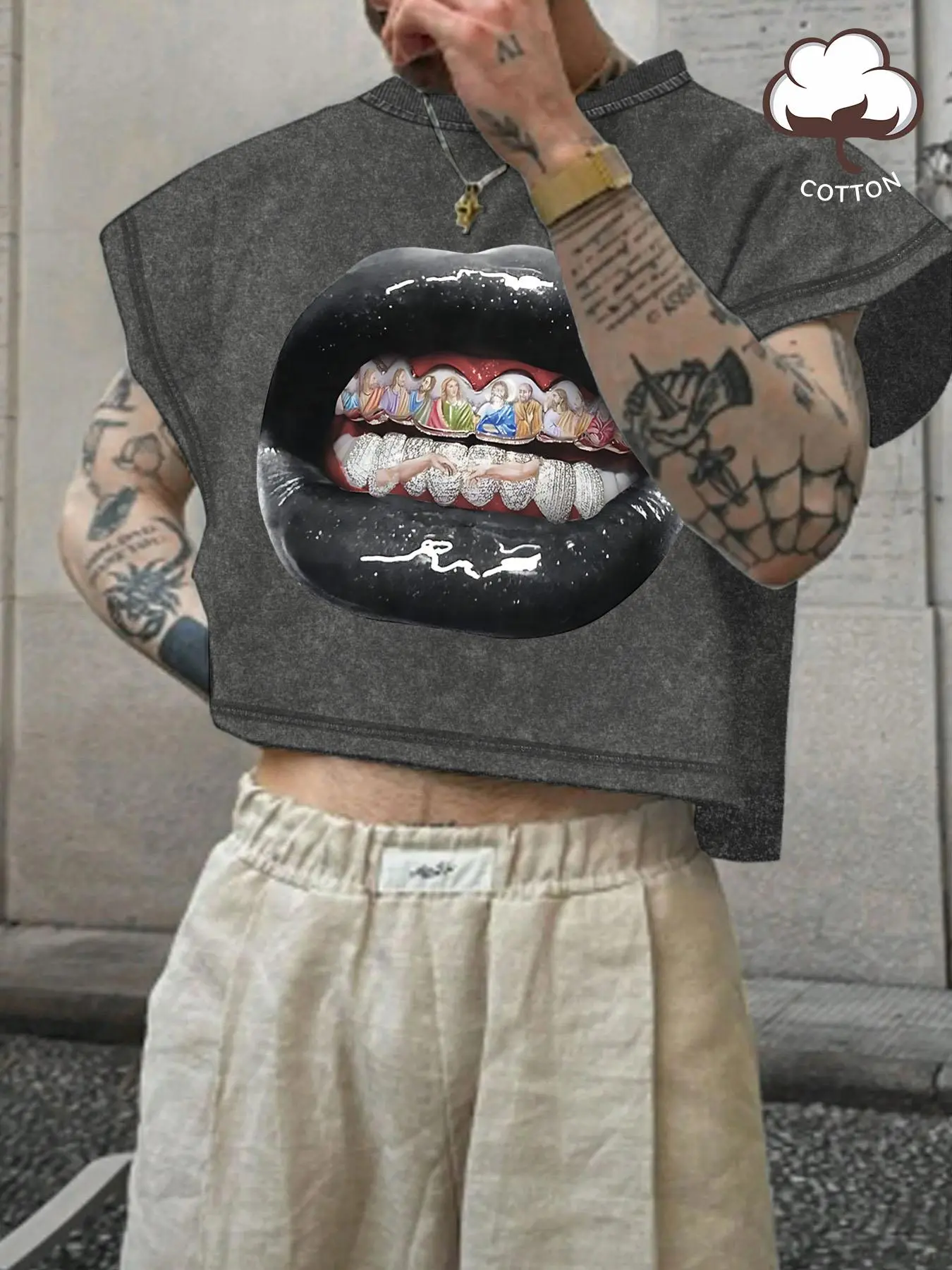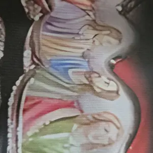 The teeth are white religious figures