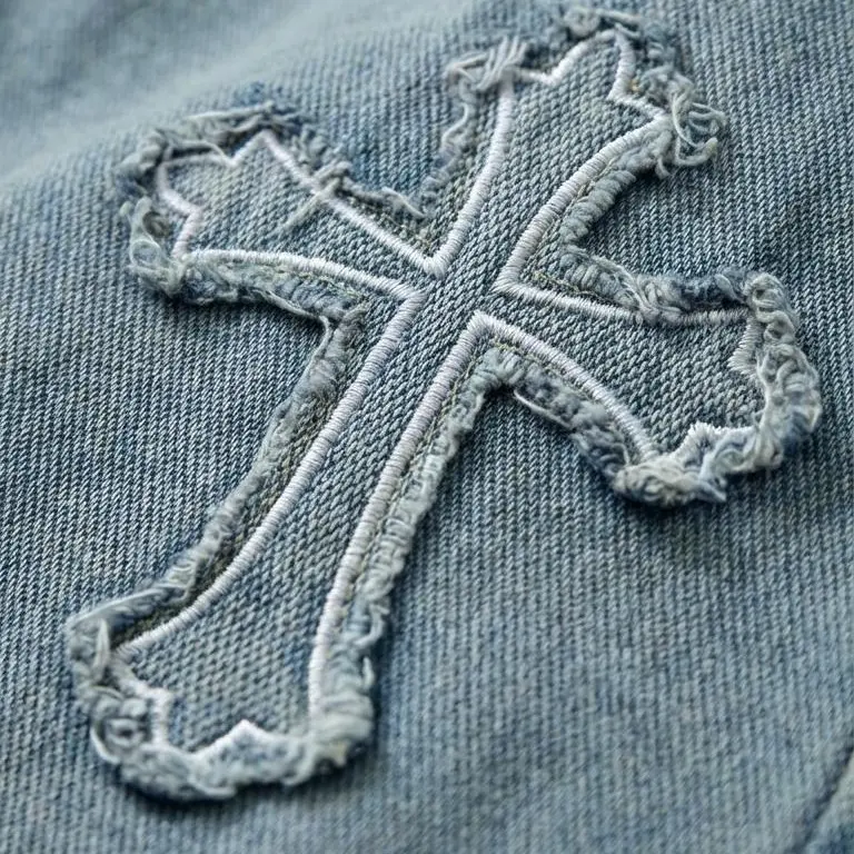 Not a print, but a dimensional vow stitched with thousands of threads. Every edge of these crosses holds the artisan's breath of warmth.#trendingjeans#widelegjeans#viraljeans#fyp#muslim