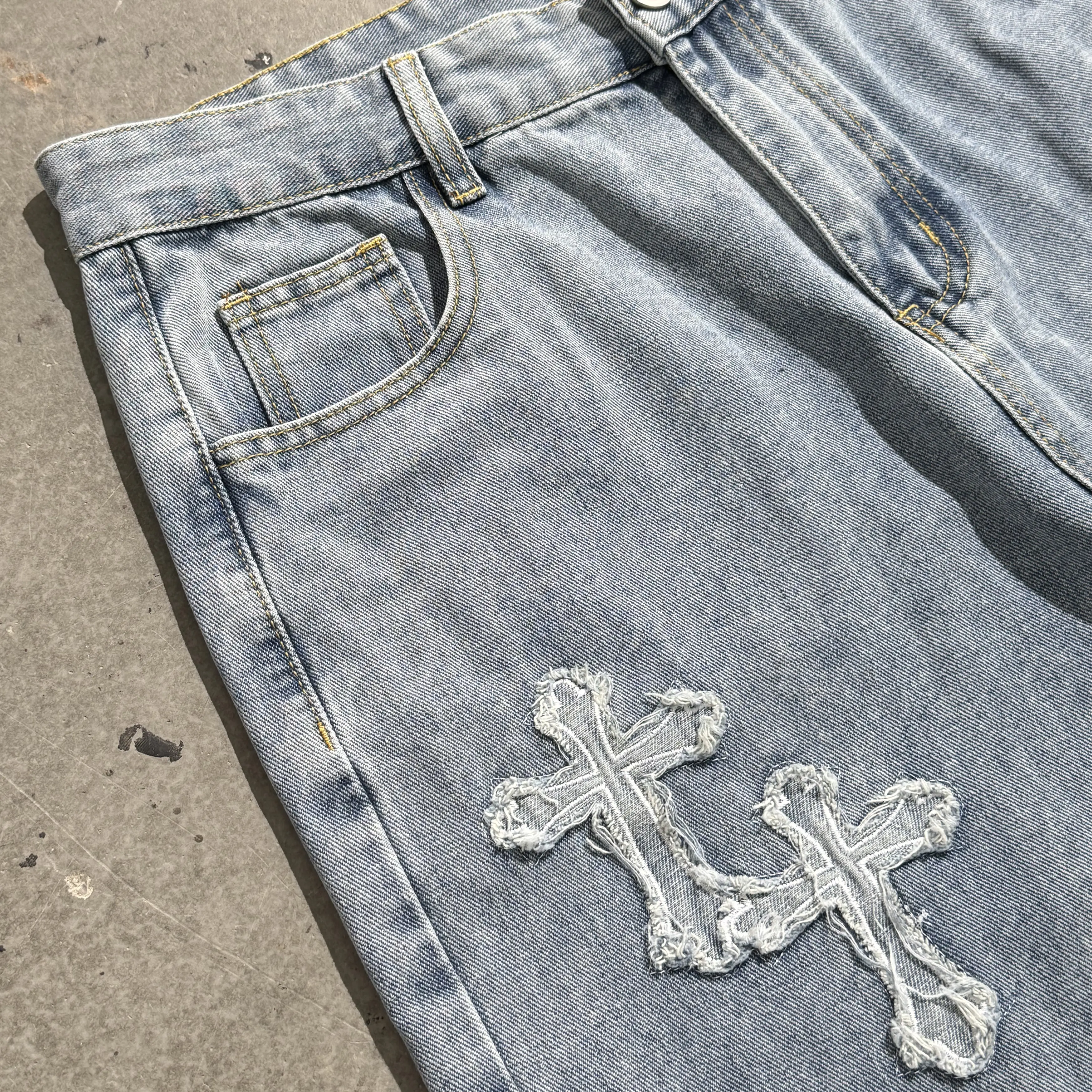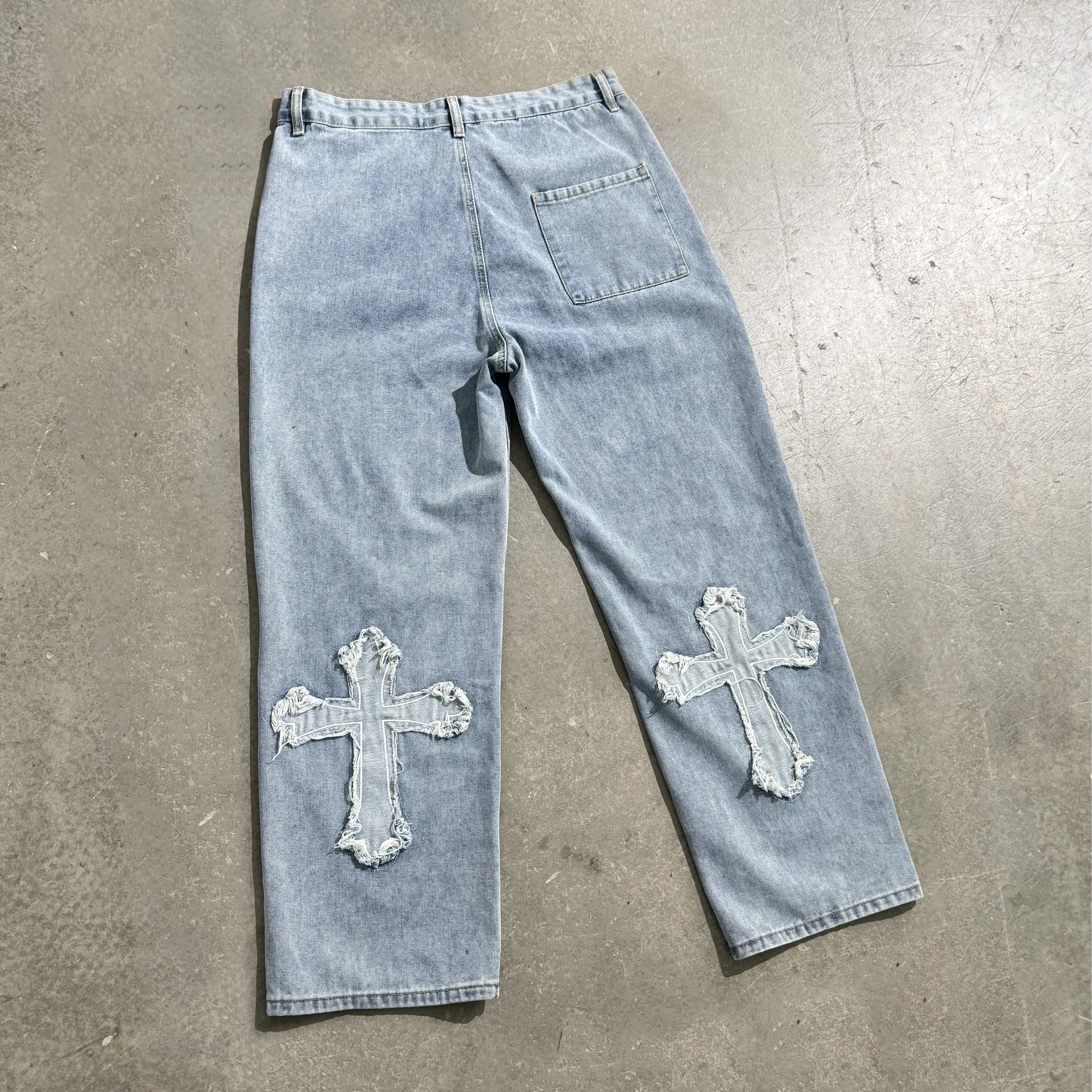 These are divine pants, handpicked by God! The all-over cross embroidery gives them a halo effect as you walk.#ChurchCore #ReligiousTrend #Deconstructionism #WashedDenim #EmbroideredDenim
