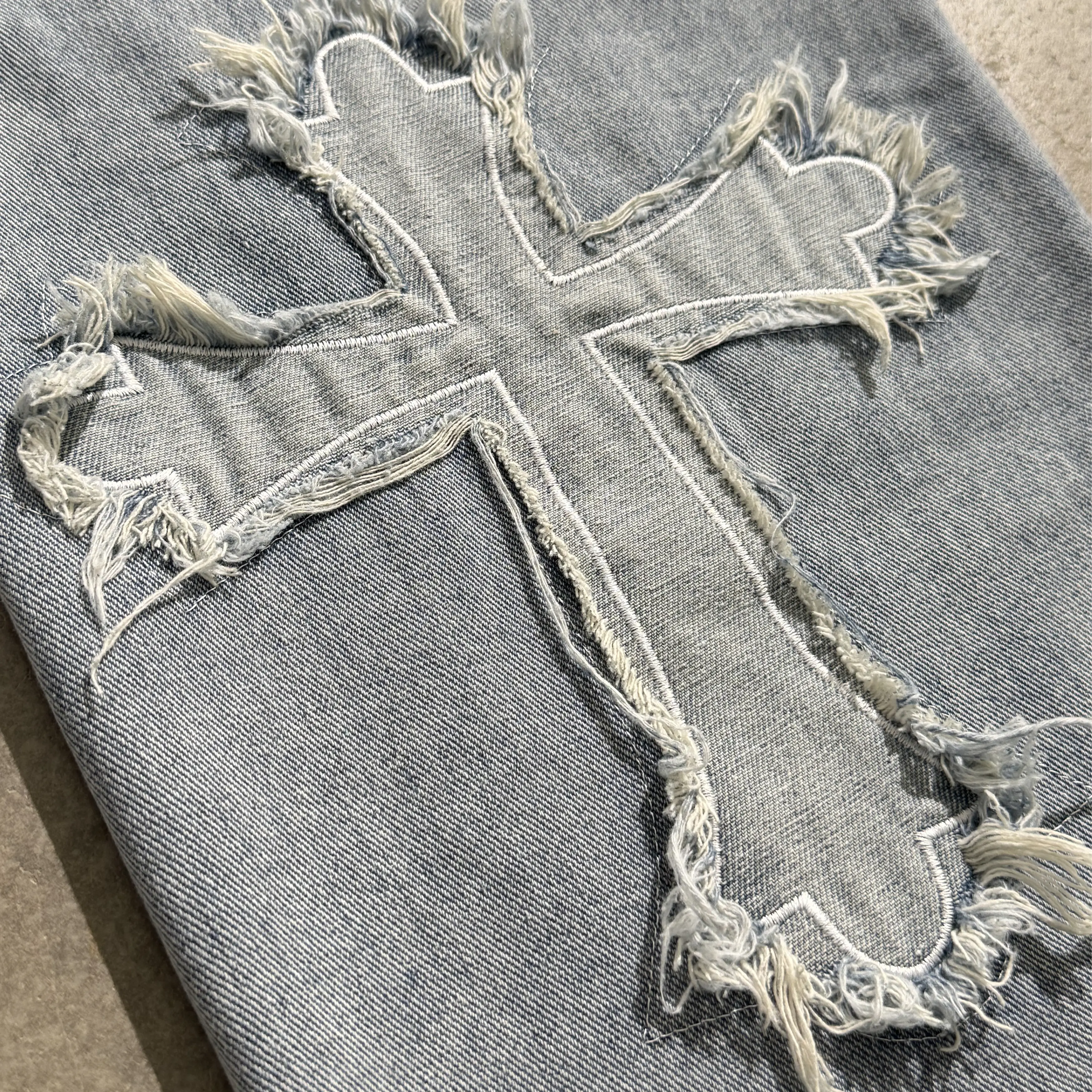 Even God would approve of this ripped design! Each cross patch is a badge of honor for a miraculous rebirth.#crossjeans #jesusjeans #battledamaged #churchpunk #altfashion