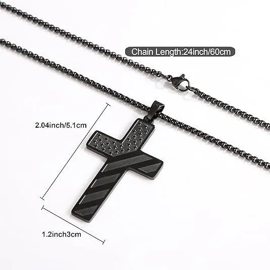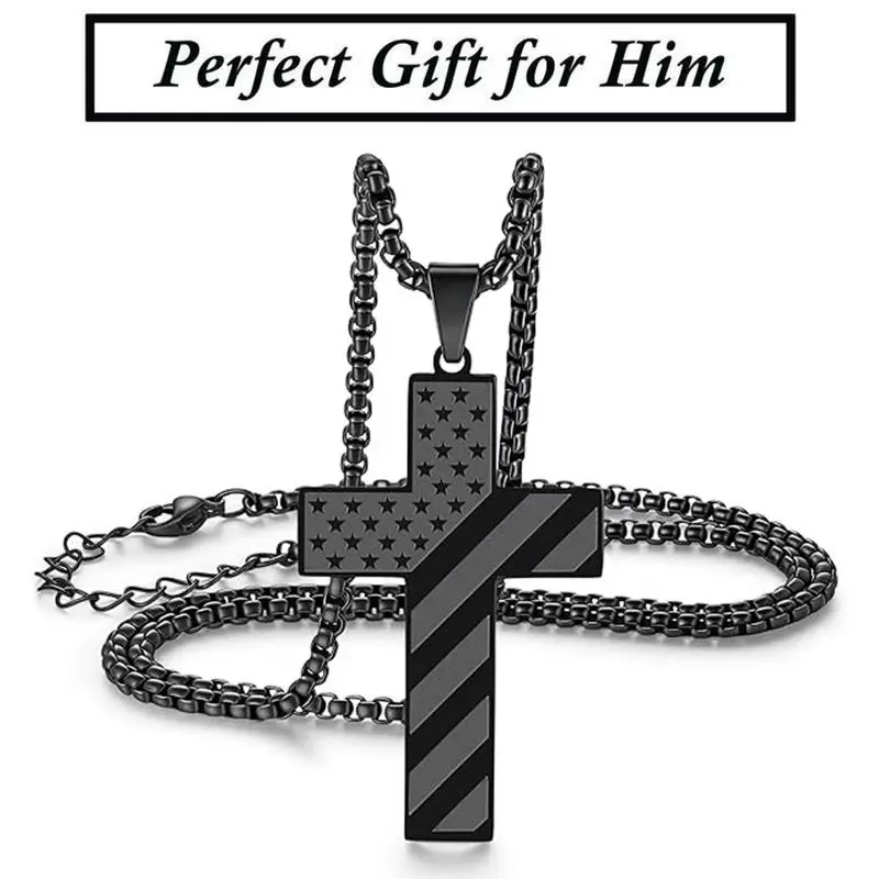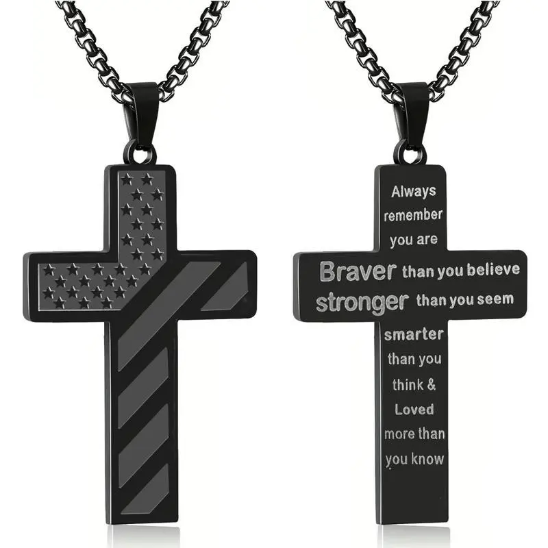 Men's Cross Necklace: Bible Verse & American Flag Pendant | Stainless Steel Patriotic Faith Chain - Bold Gift for Him For the man who wears his beliefs with pride, this Men’s Cross Necklace is more than jewelry — it’s a powerful blend of faith and patriotism, crafted to make a statement. Featuring a striking cross, an embedded Bible verse, and an American flag pendant, all set on a bold stainless steel chain, it’s a wearable tribute to what matters most: conviction, country, and courage. A Symbol of Faith & Patriotism, Woven Together At the heart of this necklace lies a thoughtful design that honors two core values: *Faith That Guides: The central cross is paired with a delicate engraving of a meaningful Bible verse (e.g., “I can do all things” or “Trust in the Lord”), serving as a constant reminder of strength and purpose. It’s a quiet yet powerful way to carry spiritual grounding through daily life.*Pride in Country: Accompanying the cross is a detailed American flag pendant, a symbol of heritage, freedom, and love for nation. Together, these elements create a piece that feels personal and profound — perfect for men who hold both faith and patriotism close. Bold Design, Built to Last Crafted with the modern man in mind, this necklace balances ruggedness with refinement: *Stainless Steel Durability: Made from high-quality stainless steel, the chain and pendants are resistant to rust, tarnish, and daily wear. Whether he’s at work, hitting the gym, or outdoors, it stays looking sharp — no need for delicate care.*Bold & Masculine Silhouette: The chain features a sturdy, medium-weight link design that feels substantial without being bulky, while the pendants (cross, Bible verse, and flag) are sized to make an impact without overcomplicating the look. It’s bold enough for casual outings and polished enough for special occasions.*Comfortable Fit: The adjustable chain (typically 20–24 inches) ensures a snug yet comfortable fit for most neck sizes, with a secure lobster clasp that stays in place throughout the day. More Than Jewelry — A Meaningful Gift This necklace isn’t just an accessory — it’s a gesture that speaks volumes. It’s the perfect gift for: *Fathers & Grandfathers: Honor their legacy of faith and love for country.*Husbands & Boyfriends: A unique way to celebrate his beliefs and passions.*Graduations & Milestones: Mark a new chapter with a symbol of strength and purpose.*Veterans or Service Members: A tribute to their service and the values they defend. Why It Stands Out *Dual Meaning: Few pieces manage to blend faith and patriotism as seamlessly — this one does it with intention, avoiding cliché in favor of sincerity.*Everyday Versatility: It pairs effortlessly with t-shirts, button-downs, or jackets, making it a go-to accessory for any outfit.*Timeless Appeal: The classic design ensures it won’t go out of style, becoming a piece he’ll wear and cherish for years. What You Get: 1 x Men’s Cross Necklace with Bible Verse & American Flag Pendant, featuring a stainless steel bold chain and adjustable length — ready to be worn with pride or gifted with love. For the man who lives with purpose, this necklace is more than metal and stone. It’s a reflection of who he is: faithful, patriotic, and unapologetically bold