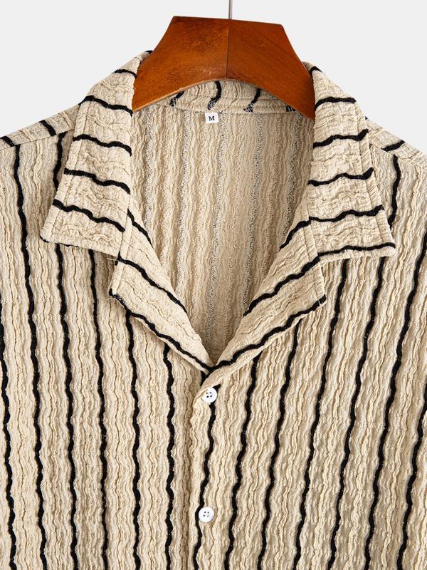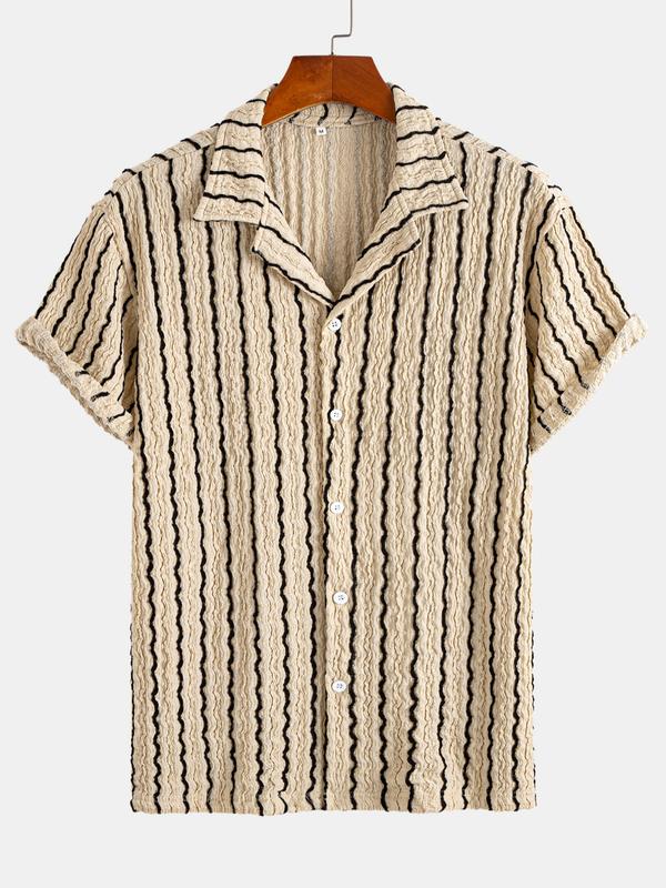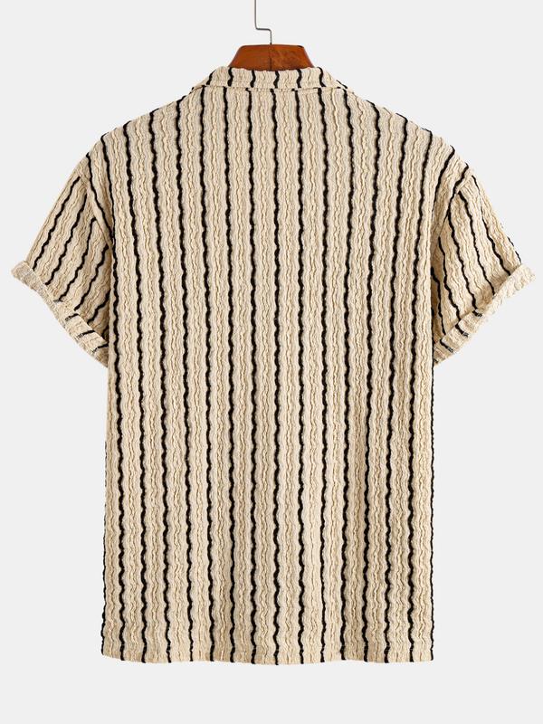 Men's Spring Summer Casual Vacation Cuban Collar Short Sleeve Shirt, Knitted Jacquard Striped Leisure Top, Comfortable Breathable Fabric