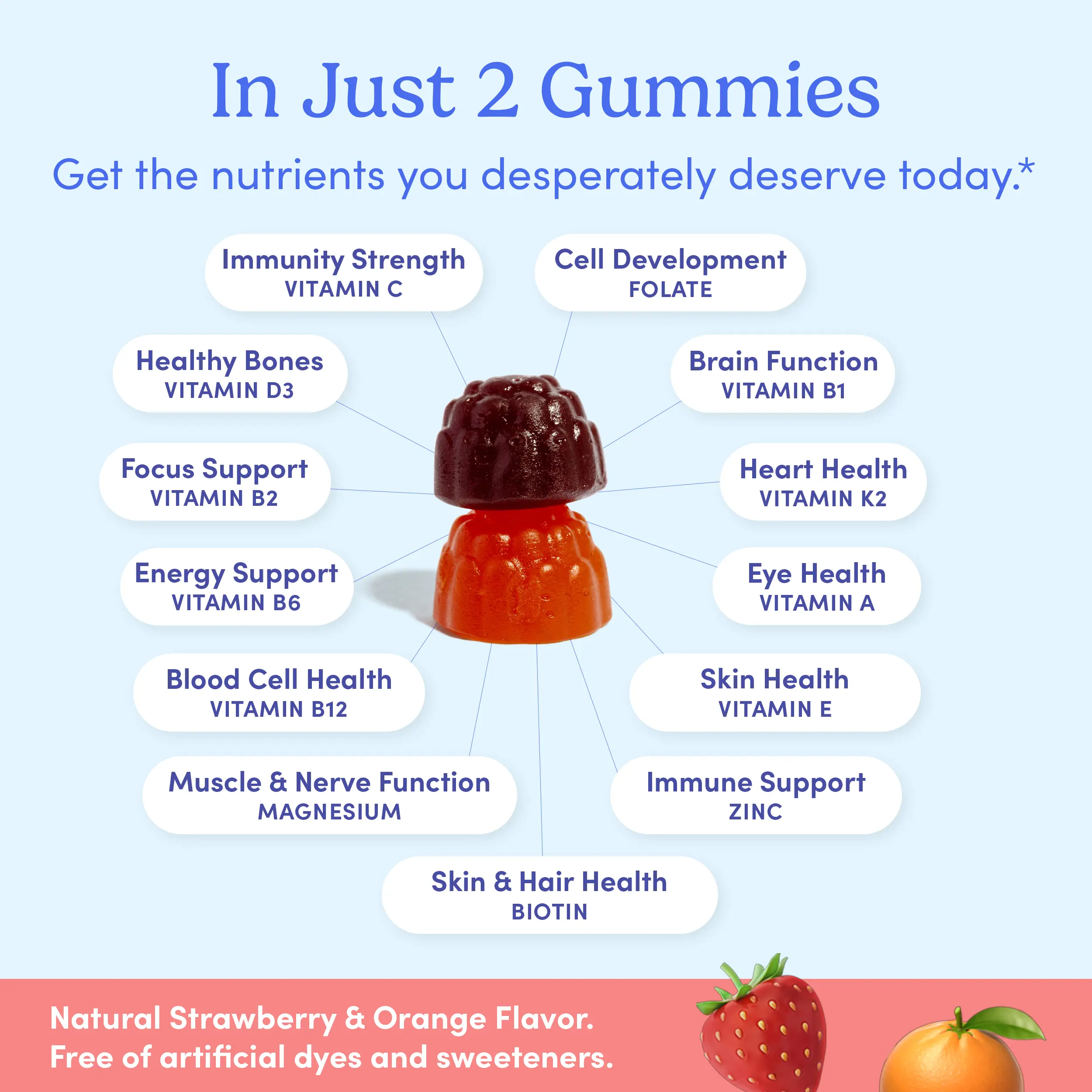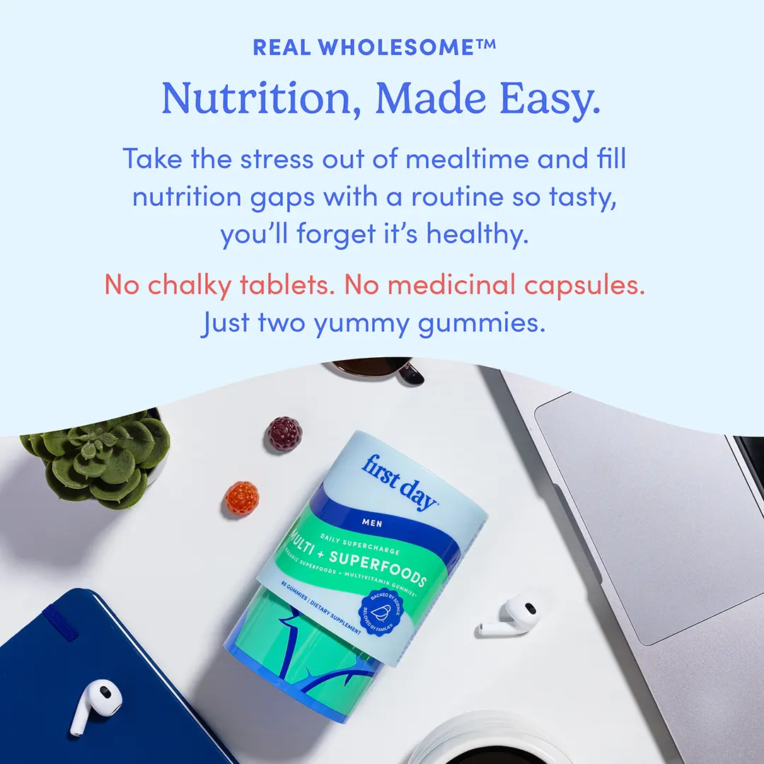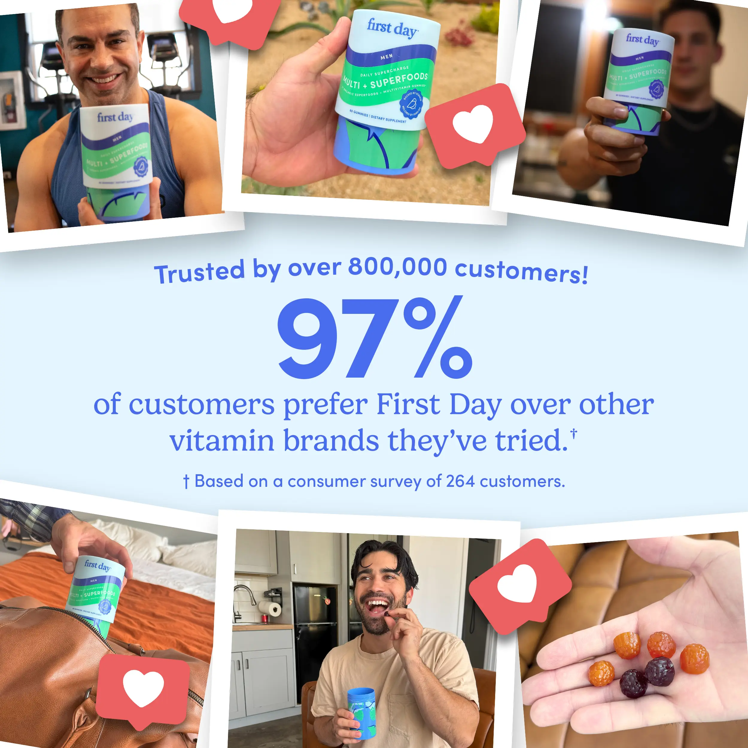 A: Remember the old adage "more isn't always better"? Many vitamins today use cheap chemicals that our bodies can't absorb in amounts that are much higher than we actually need! In the long term, taking these sorts of vitamins can be harmful to health because our bodies have a tough time getting rid of the excess. Take plants as an example. Overwatering your plants can damage their roots, wilt the leaves, and ruin their growth. That's why First Day focuses on being a nourishing vitamin filling in the gaps, not overloading you with nutrients. So, we've consciously formulated our vitamin around what we most commonly lack. Then we made our gummy to fill the gaps in our everyday needs with the finest ingredients.