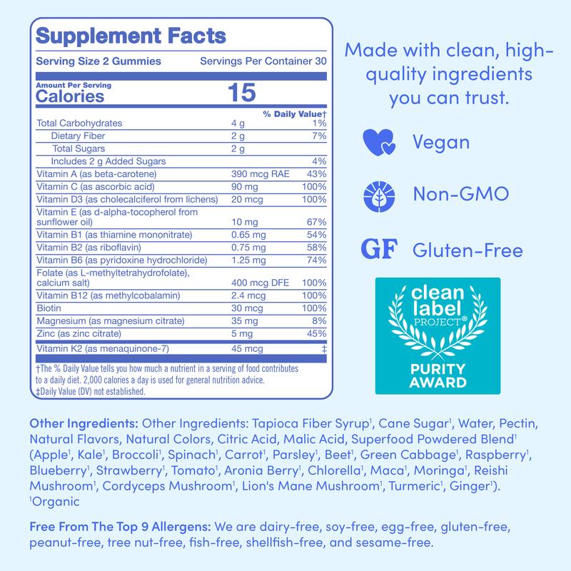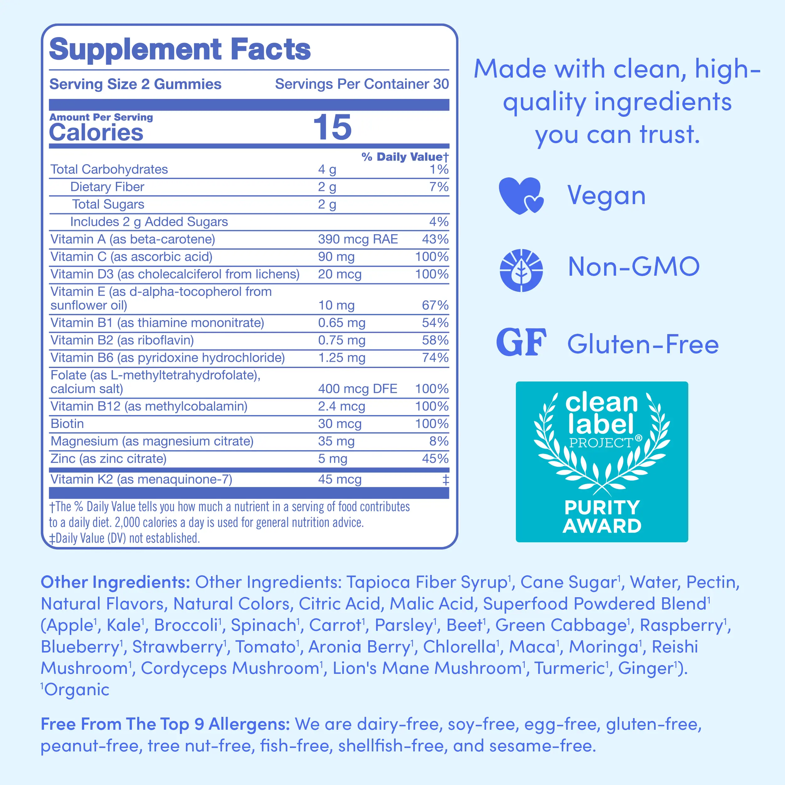 Other Ingredients: Tapioca Syrup‡, Cane Sugar‡, Water, Pectin, Citric Acid, Natural Flavors, Superfood Powdered Blend‡ (Apple‡, Kale‡, Broccoli‡, Spinach‡, Carrot‡, Parsley‡, Beet‡, Green Cabbage‡, Raspberry‡, Blueberry‡, Strawberry‡, Tomato‡, Aronia Berry‡, Chlorella‡, Maca‡, Moringa‡, Reishi Mushroom‡, Cordyceps Mushroom‡, Lion's Mane Mushroom‡, Turmeric‡, Ginger‡), Carrot and Blackcurrant and Red Bell Pepper Juice for Color.