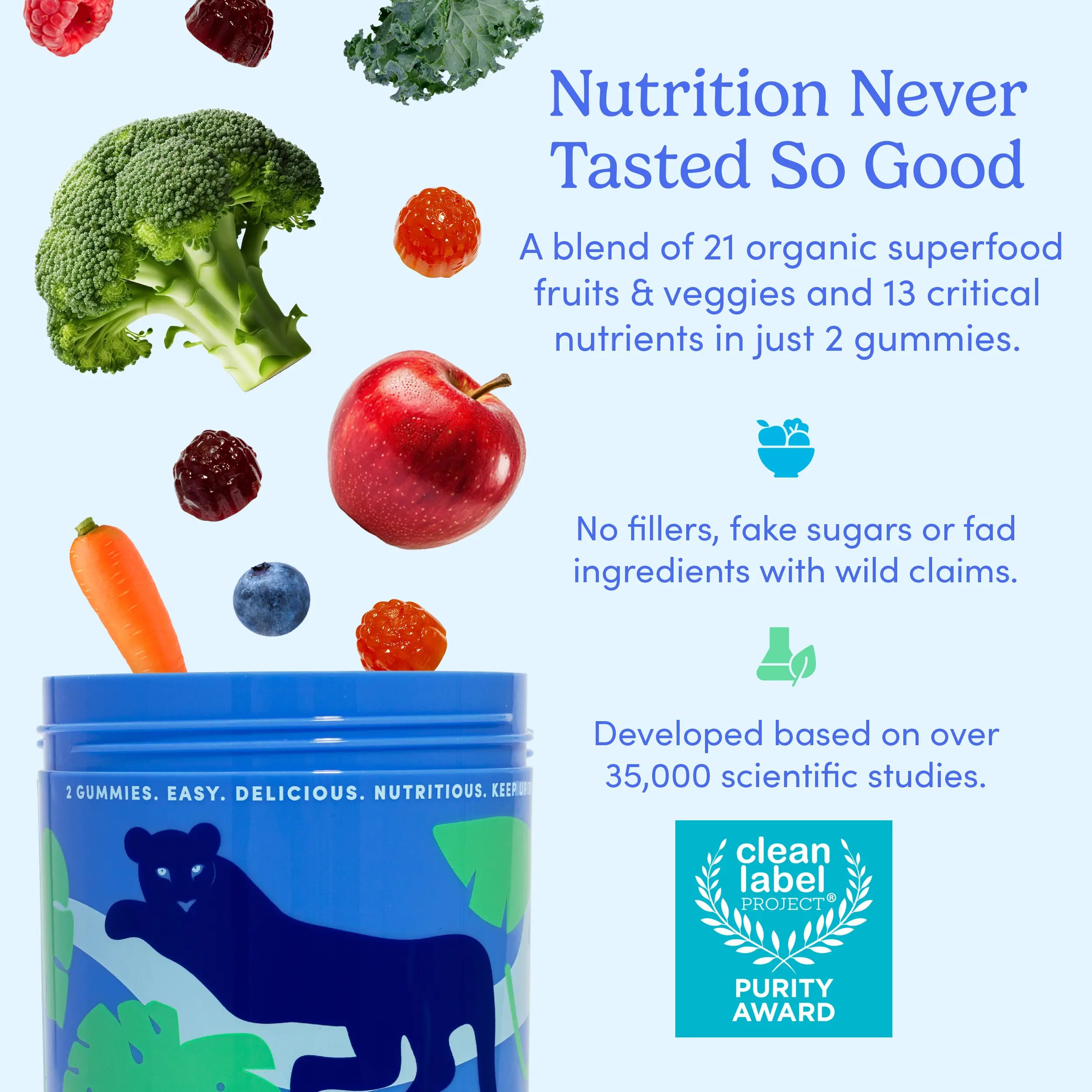 We traveled the world to find ingredients that we're proud to share. Ingredients you can actually pronounce, produced to the highest standards. Every gummy is made with 21 organic superfoods full of good-for-you antioxidants and phytonutrients.* Real food. Real simple.