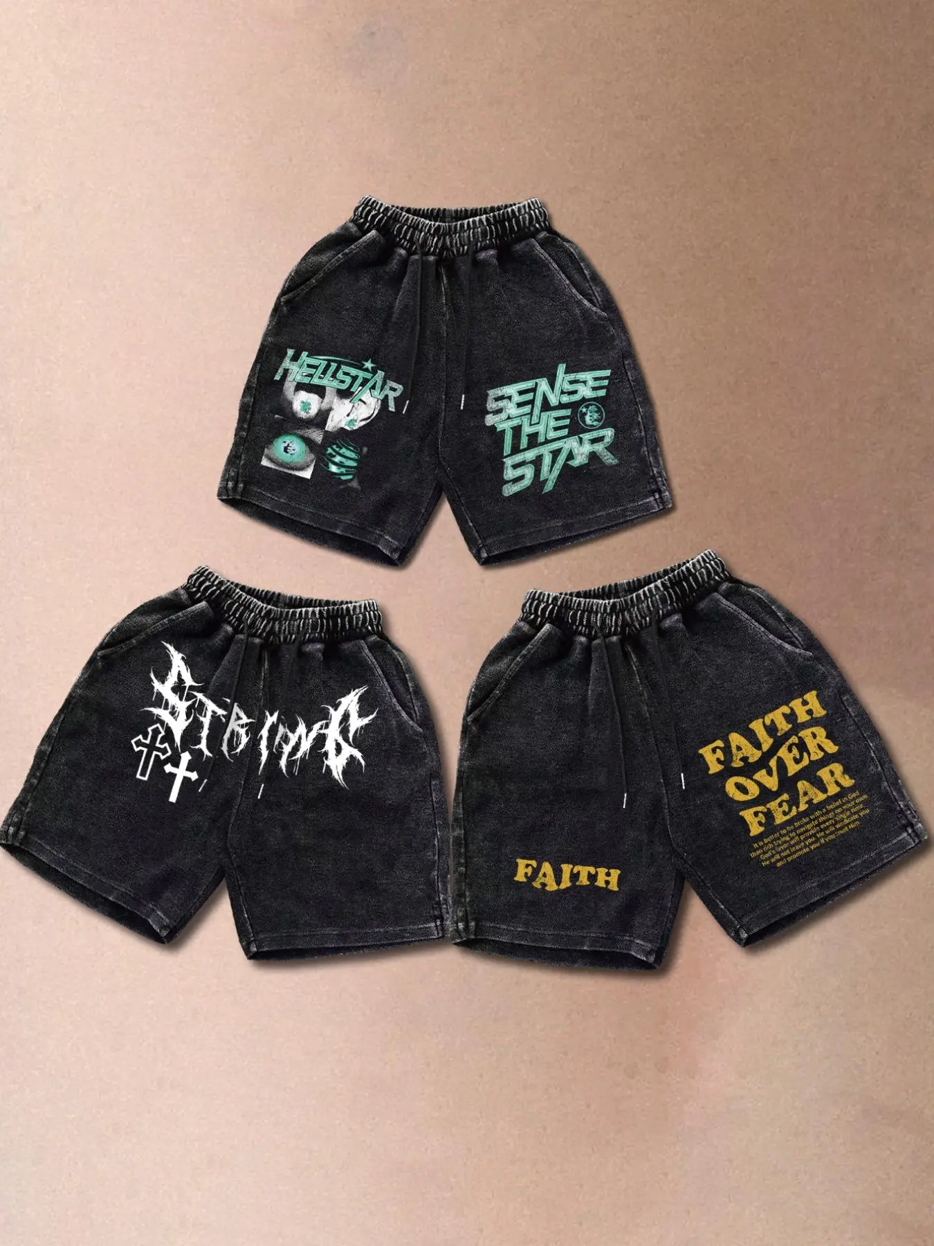 Decent enough for shorts. I don't like the Christian themed one mixed with the hell star one. Kinda rude either way. Though I agree with faith over fear but the God message under it is pretty meh