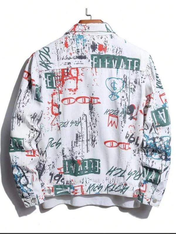 5. Men's Graffiti Letter Print Denim Jacket, Loose Casual Street Comfy Long Sleeve Outerwear for Daily Wear, Menswear for All Seasons, Coats