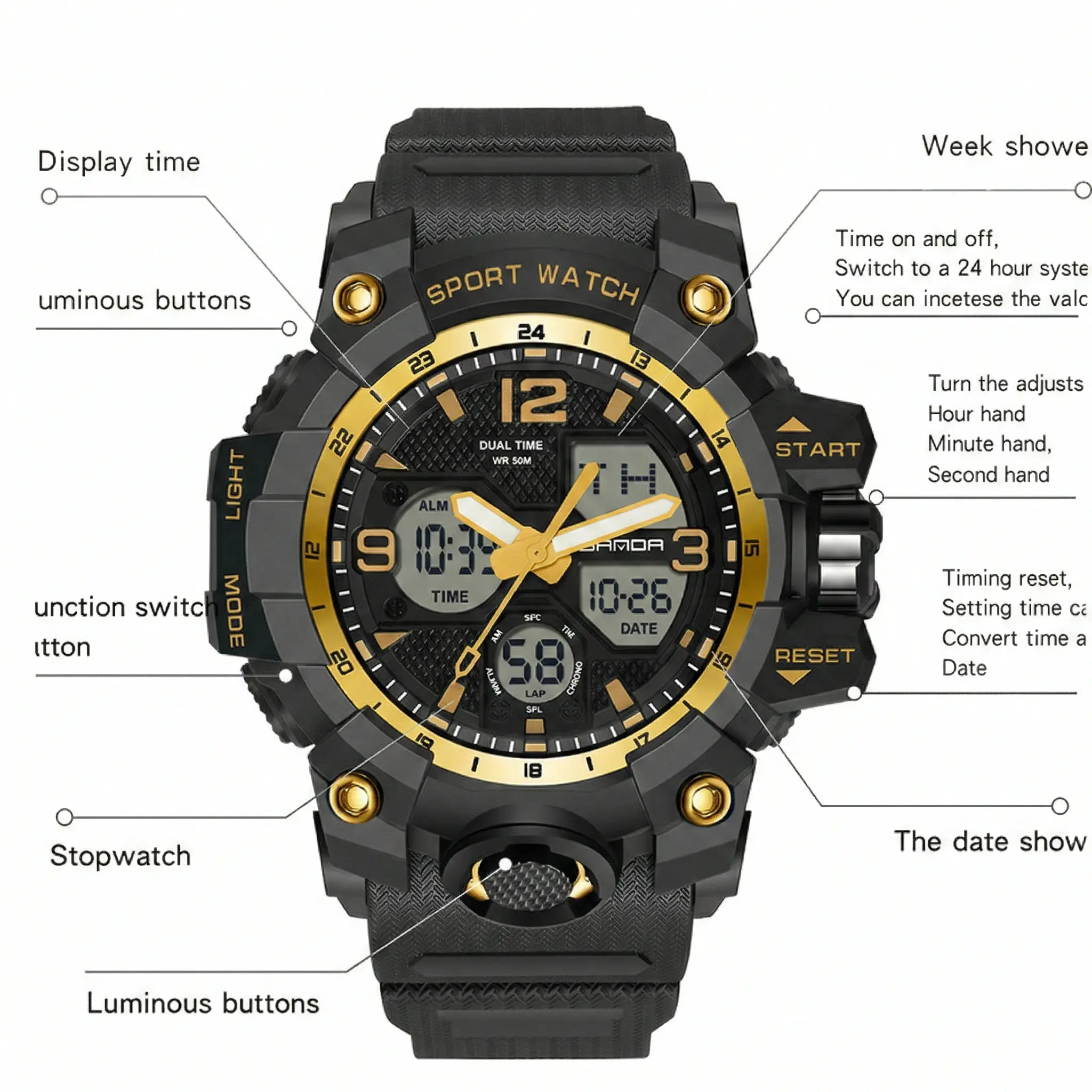 ·Multifunctional Watch: Ideal for daily use, featuring a stopwatch, calendar, day and date, alarm, water resistance, and shock resistance. Supports 12/24-hour format.