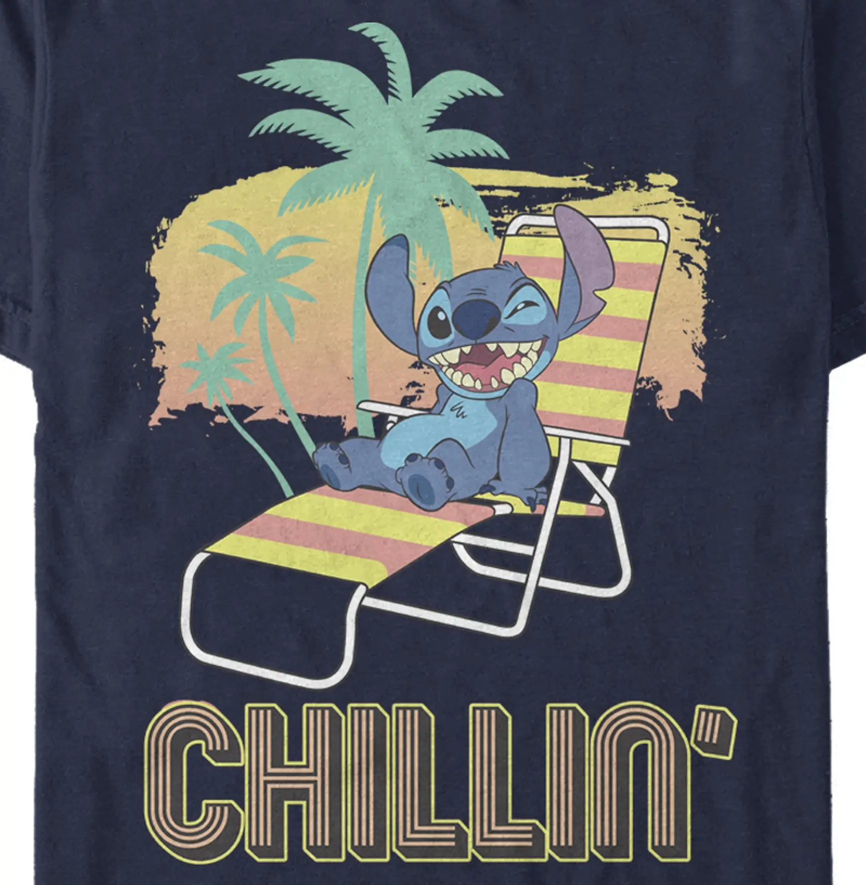 Strut your stuff with this stylish new men's t-shirt that is perfect for summer days! Featuring Stitch relaxing on the beach beneath palm trees and the word "Chillin" printed below.