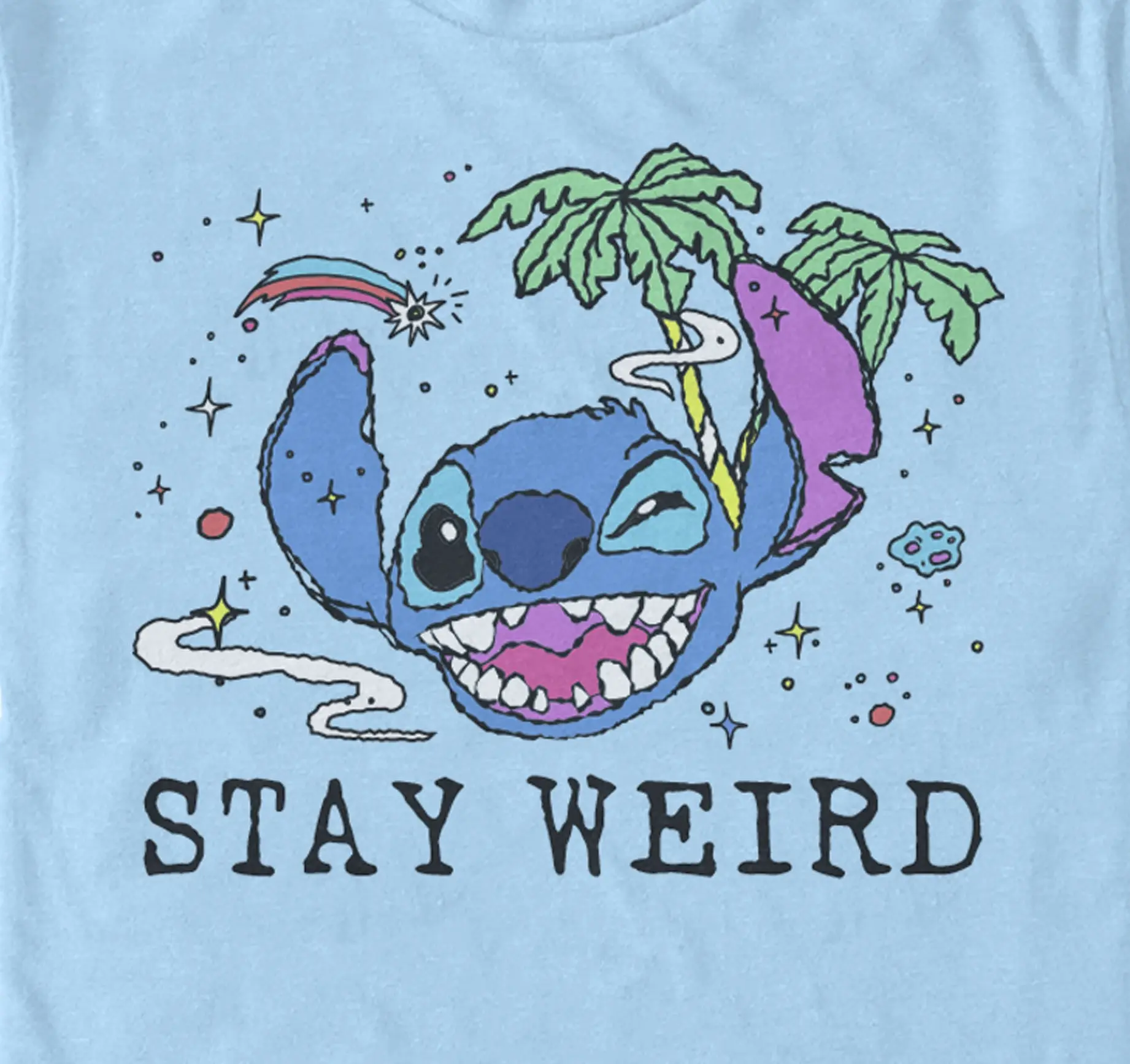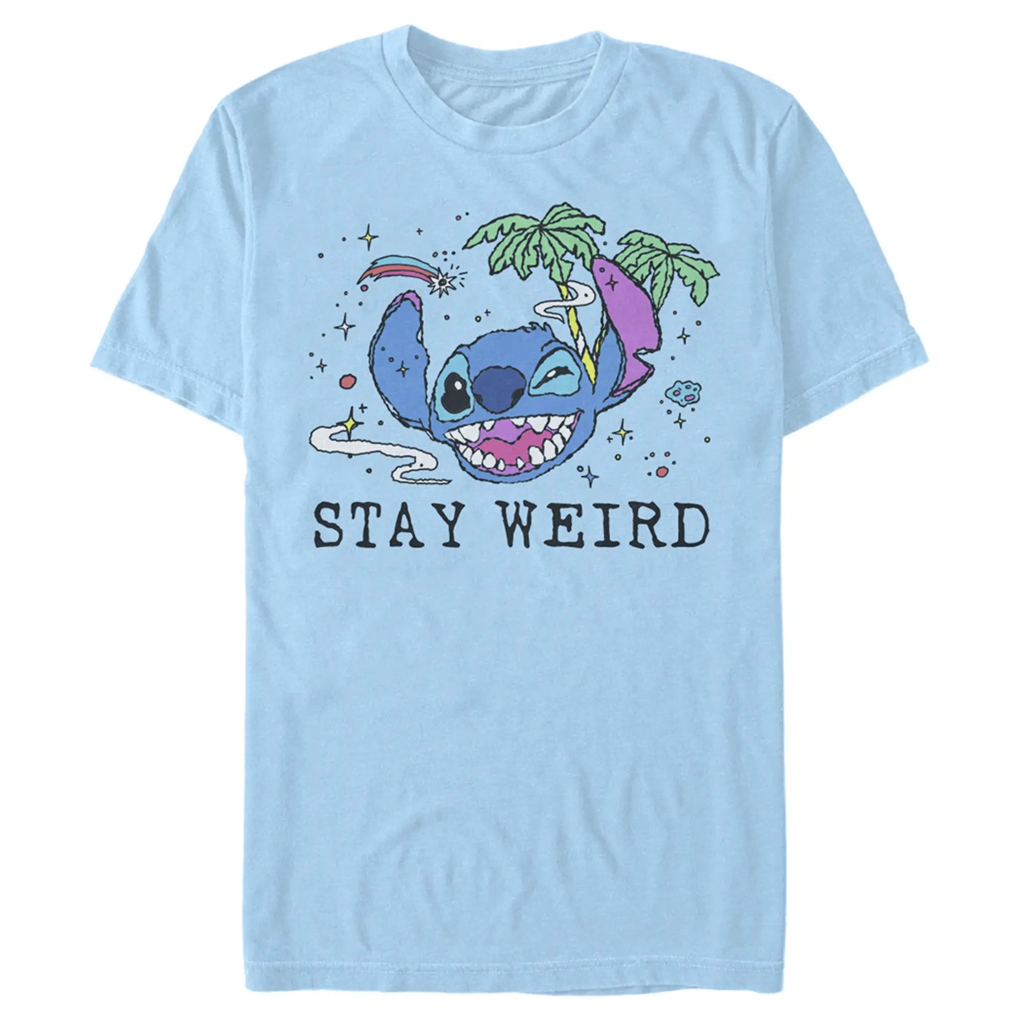 Strut your stuff with this stylish new everyday men's t-shirt that is perfect for every occasion! Featuring Stitch's smiling face surrounded by shooting stars and palm trees, with the words "Stay Weird" below.