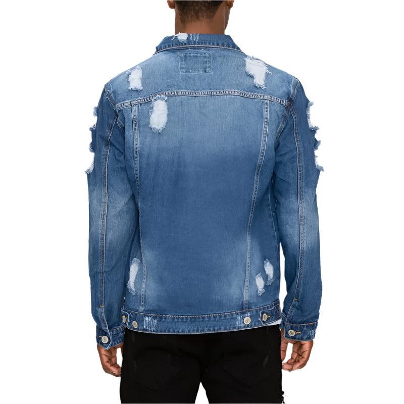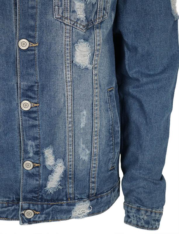 Crafted from 100% cotton for breathable comfort, this men’s distressed denim jacket is your go-to layer for instant edge. Featuring rugged distressing across the front, shoulders, and back, it brings just the right amount of boldness to any casual fit.