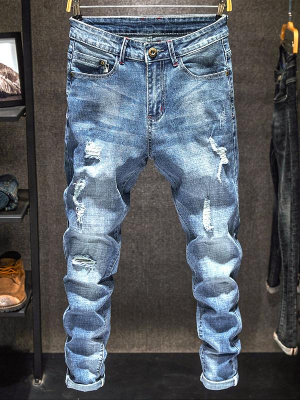 Men's Light Wash Distressed Ripped Fitted Denim Jeans, Trendy American Street Style, Perfect Gift for Husband or Boyfriend