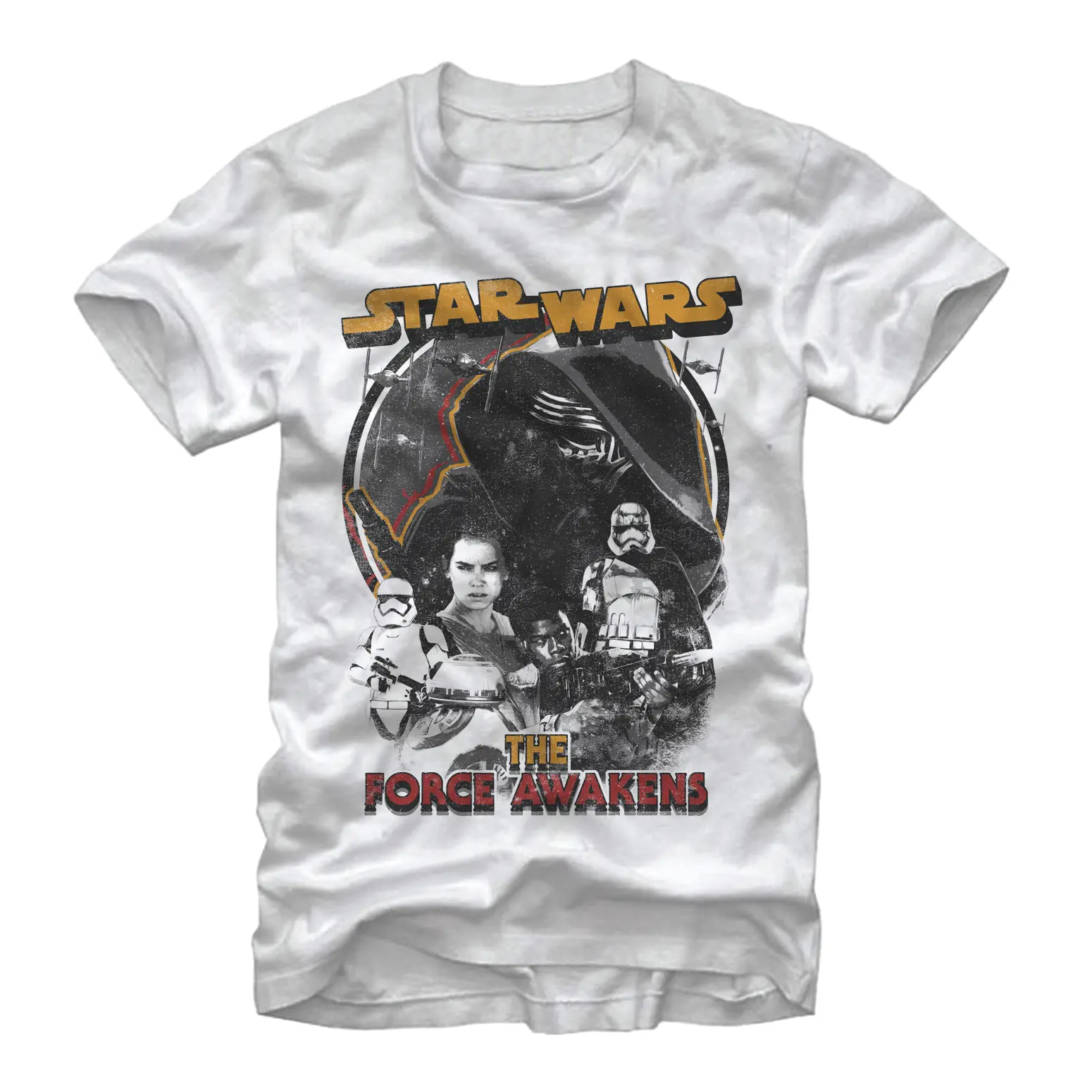 Add some Episode VII to your wardrobe with the Star Wars The Force Awakens Distressed White T-Shirt. A distressed print features Rey, Kylo Ren, Finn, Captain Phasma, BB-8, and a stormtrooper next to "Star Wars The Force Awakens" in shades of black, white, red, and golden orange.