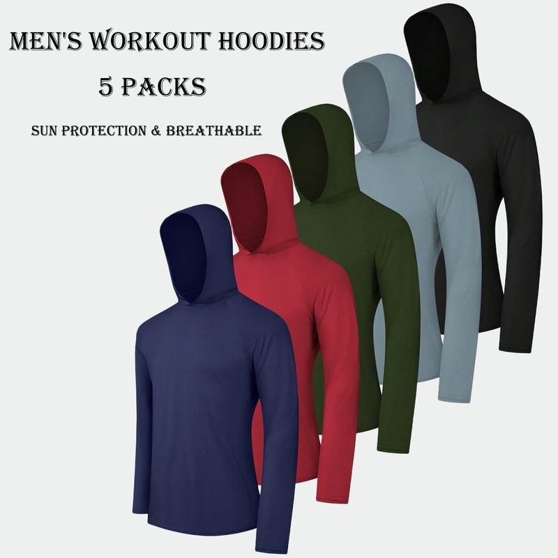 Upgrade your workout gear with our Men's Dry Fit Athletic Shirt 5 Pack. This set includes long sleeve fishing hoodies, perfect for sun protection during workouts, running, and cycling. The UPF SPF sun protection ensures you stay safe under the sun. Ideal for various activities, these rash guards offer comfort and protection.