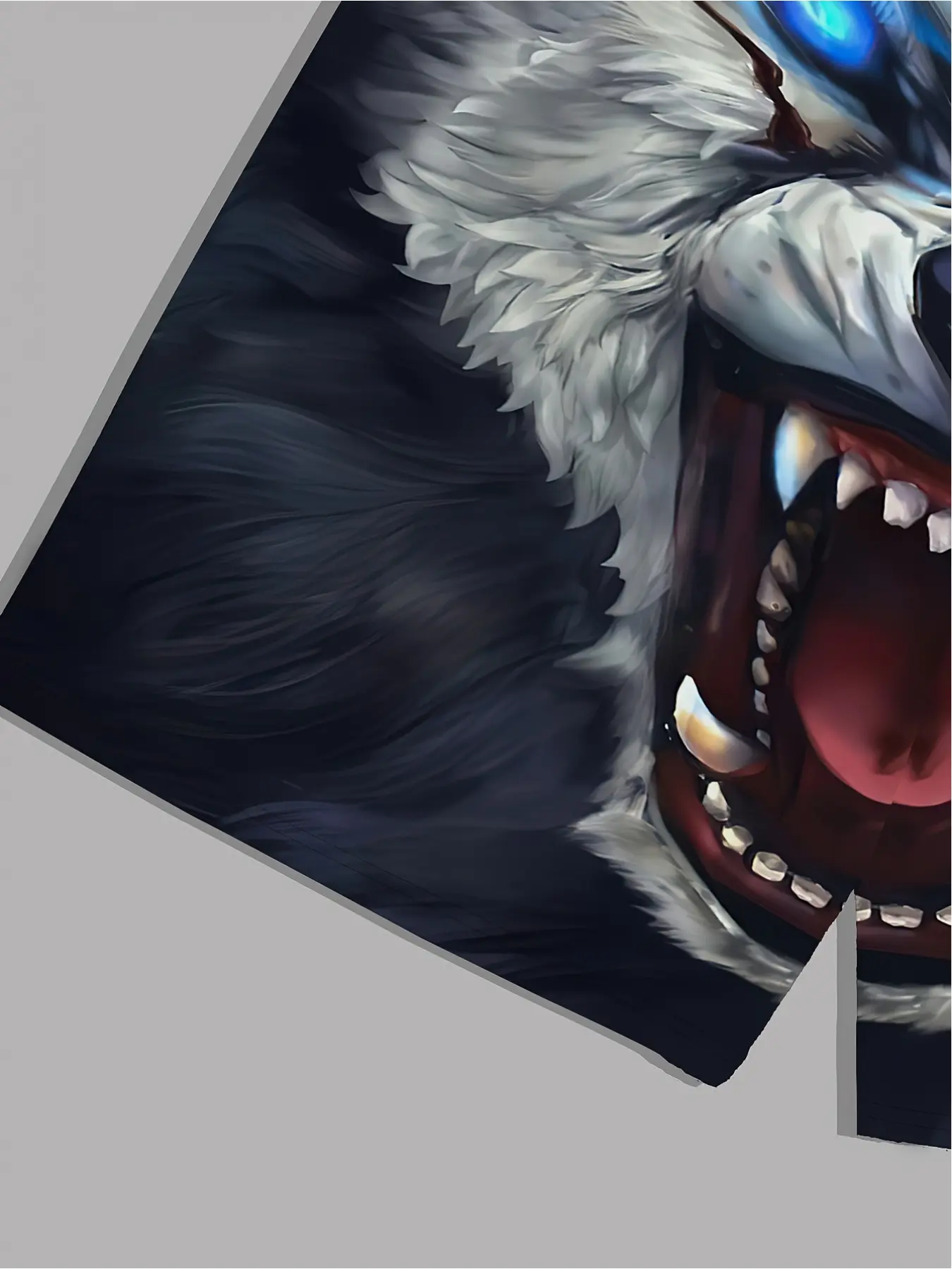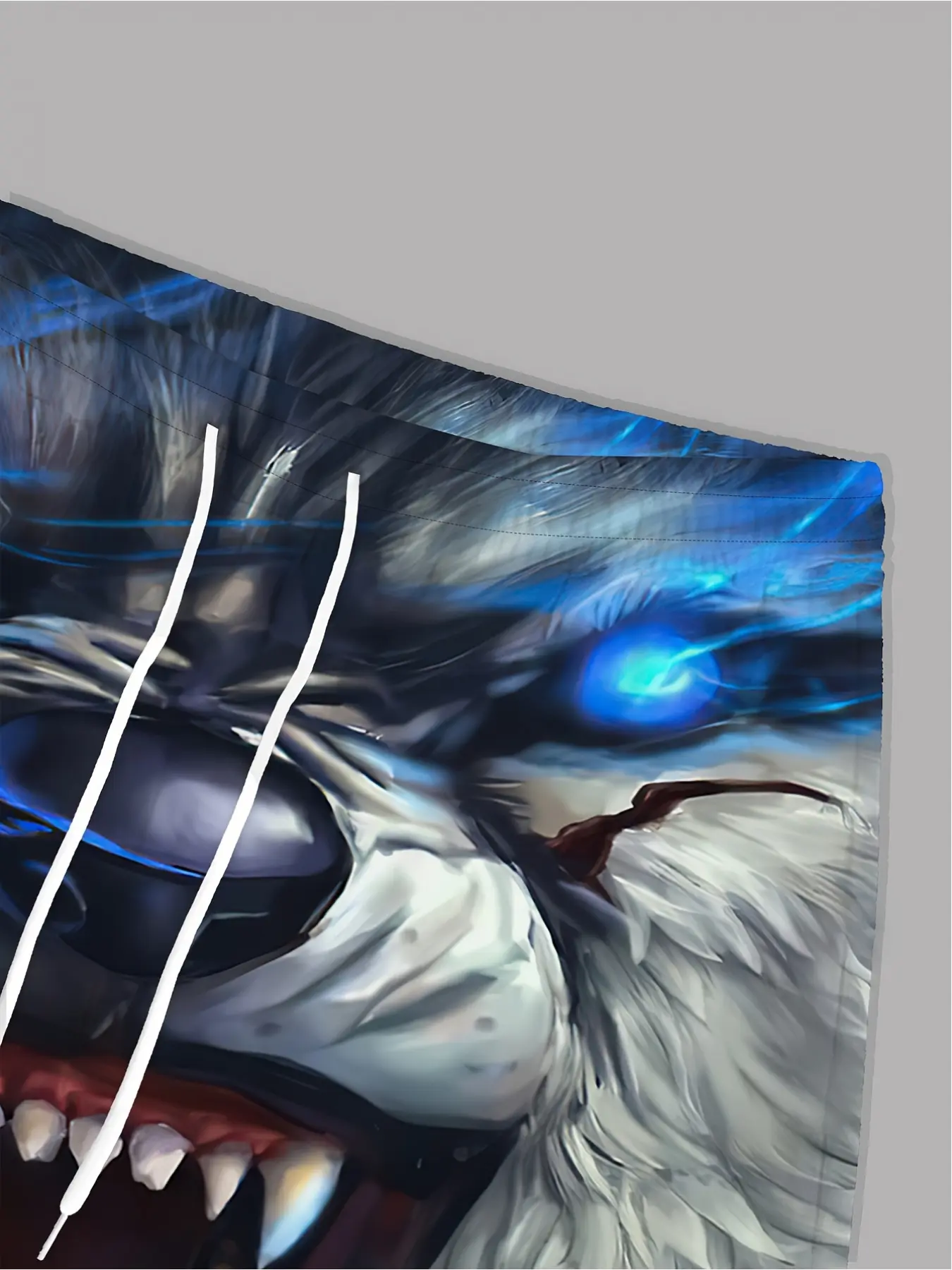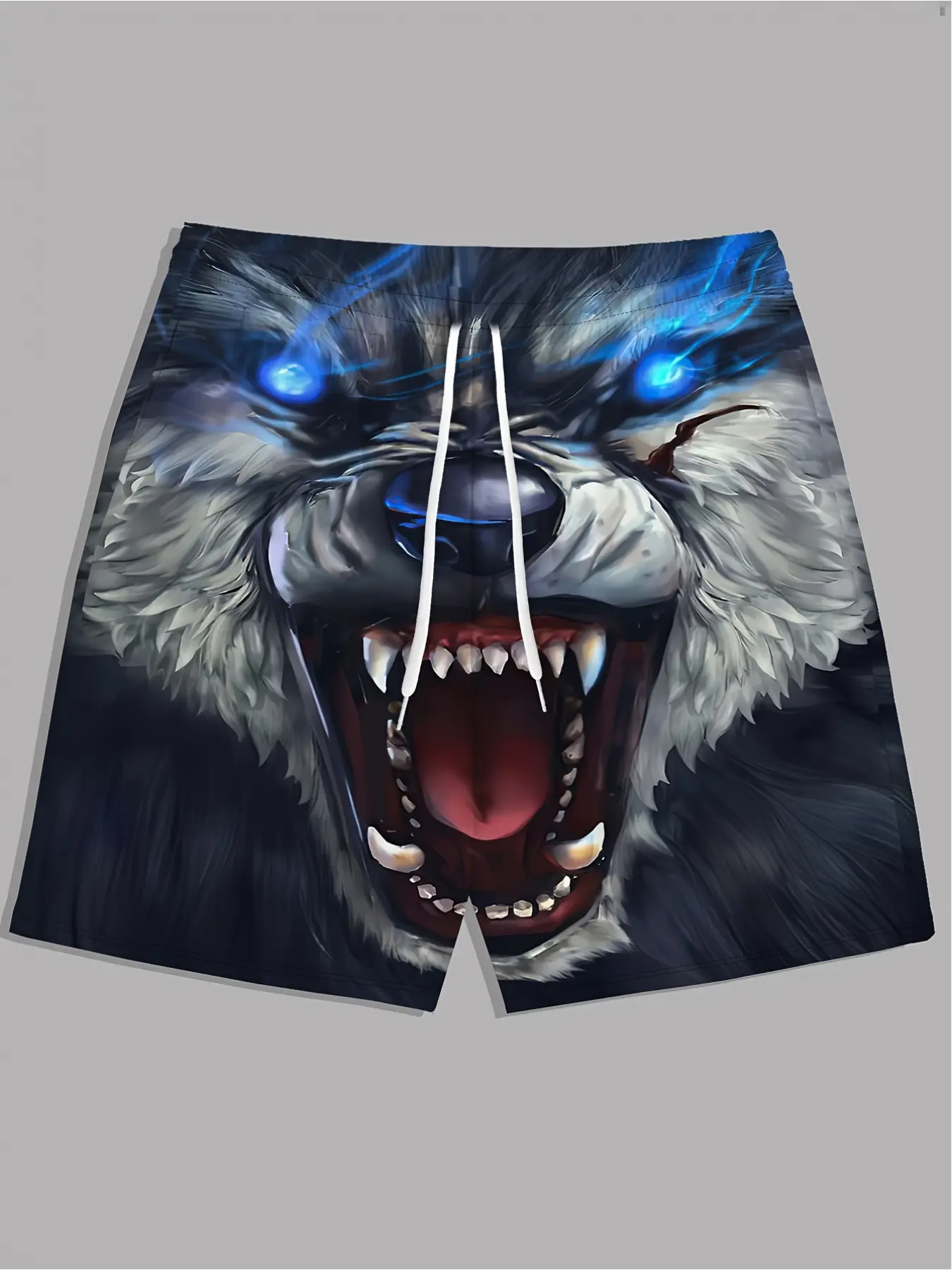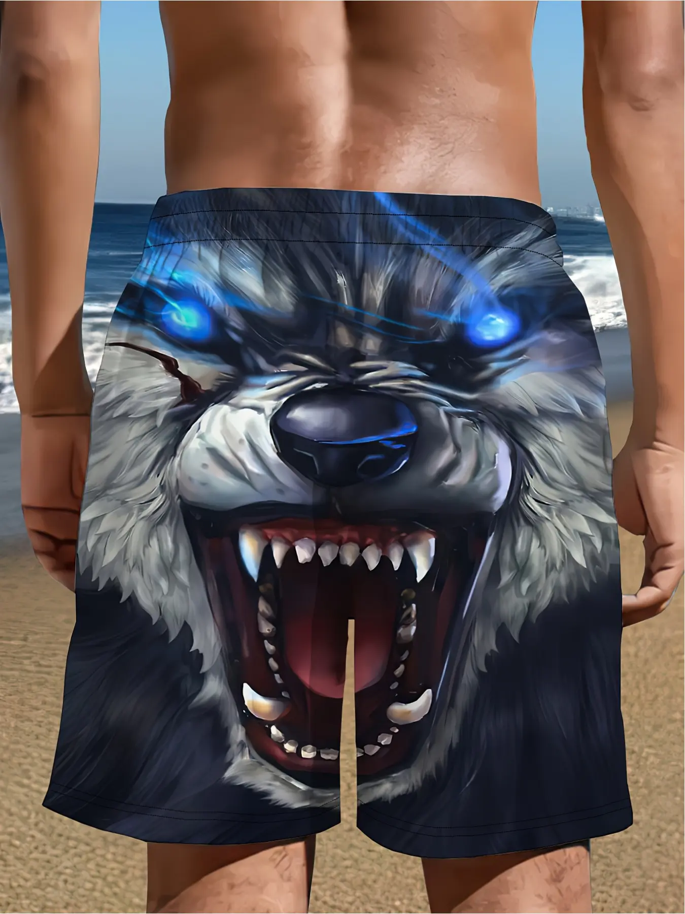 Men's extra-large and extra-extra large 3D printed pattern shorts - Bold wolf design, featuring blue eyes and white fur, breathable polyester beachwear, adjustable waist design, machine washable, adjustable swimsuit, wolf pattern shorts, polyester shorts