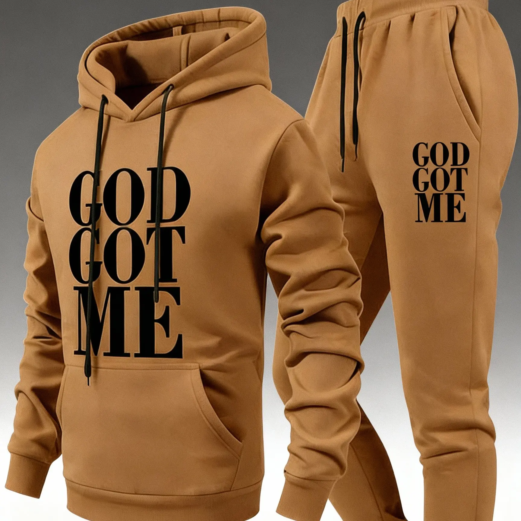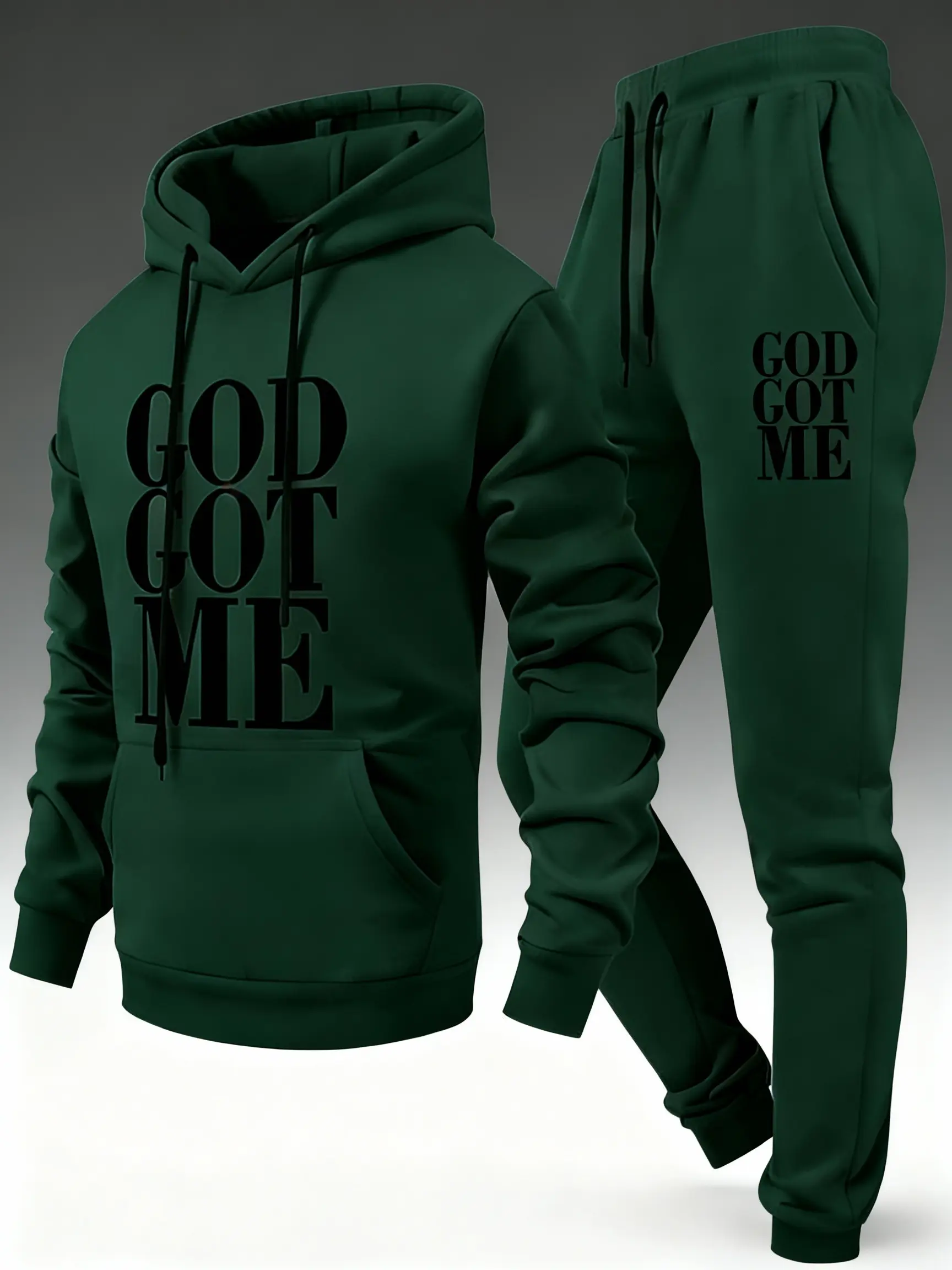 Men's 2-piece faith-themed athletic set, featuring "GODGOTME" printed hoodie & drawstring elastic waist pants, made from soft and comfortable fabric, suitable for everyday wear, street style, and casual outfits