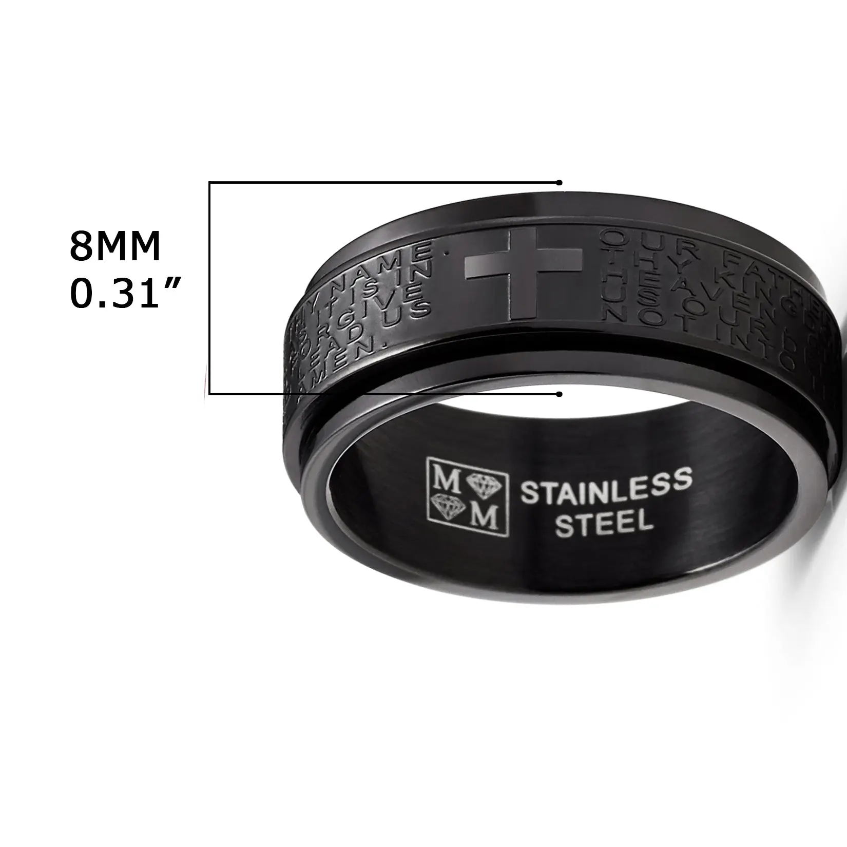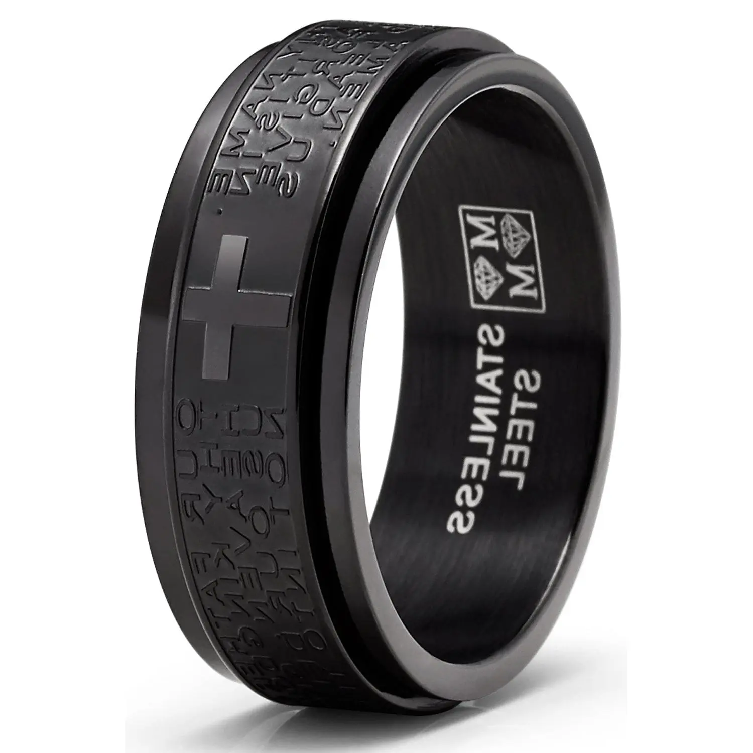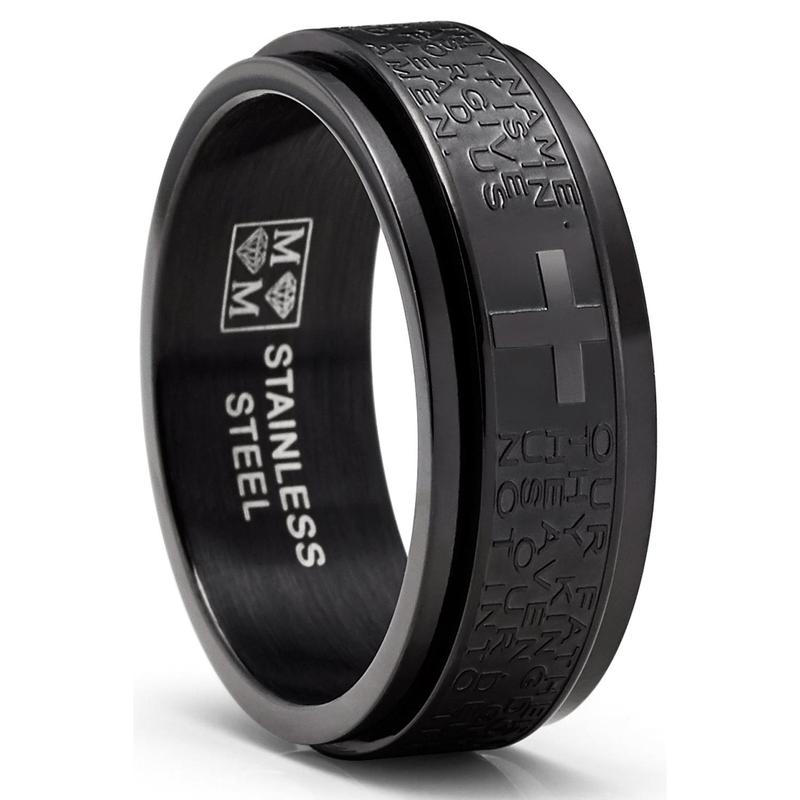 Help ease anxiety and relieve stress with this intricately crafted spinner fidget ring. Finely etched around is Matthew's 6 9-13 Lord's Prayer in raised letters, this solid Stainless Steel ring features a satin brushed center with high polish edges and a Comfort-fit band. Fidget spinner rings can help a busy brain focus & help relieve anxiety, stress and serve as a distraction in an overstimulating environment.