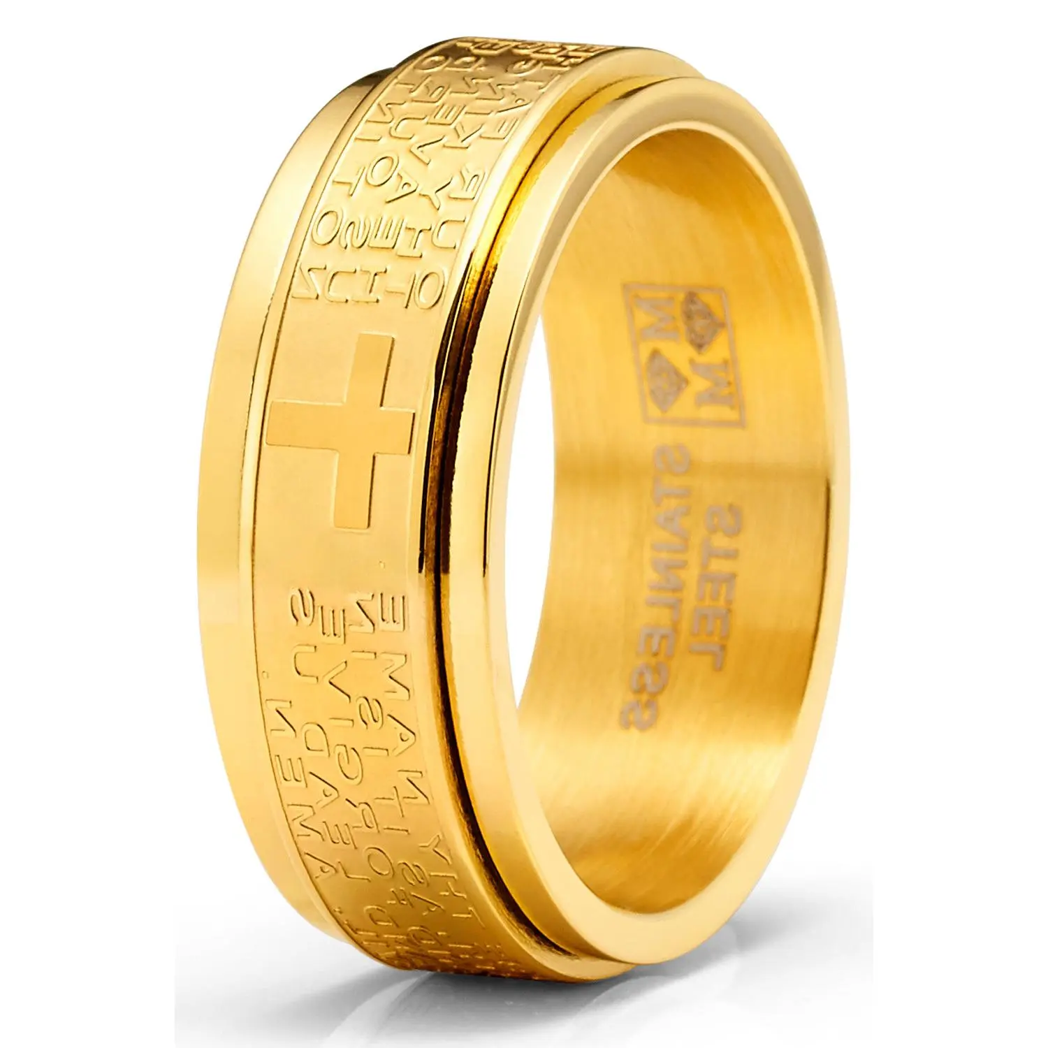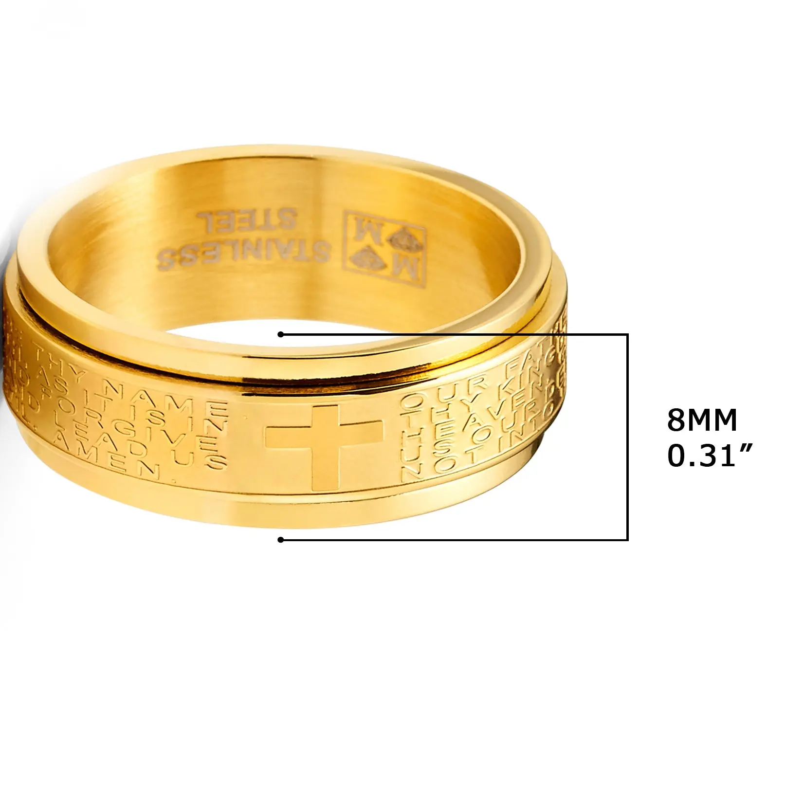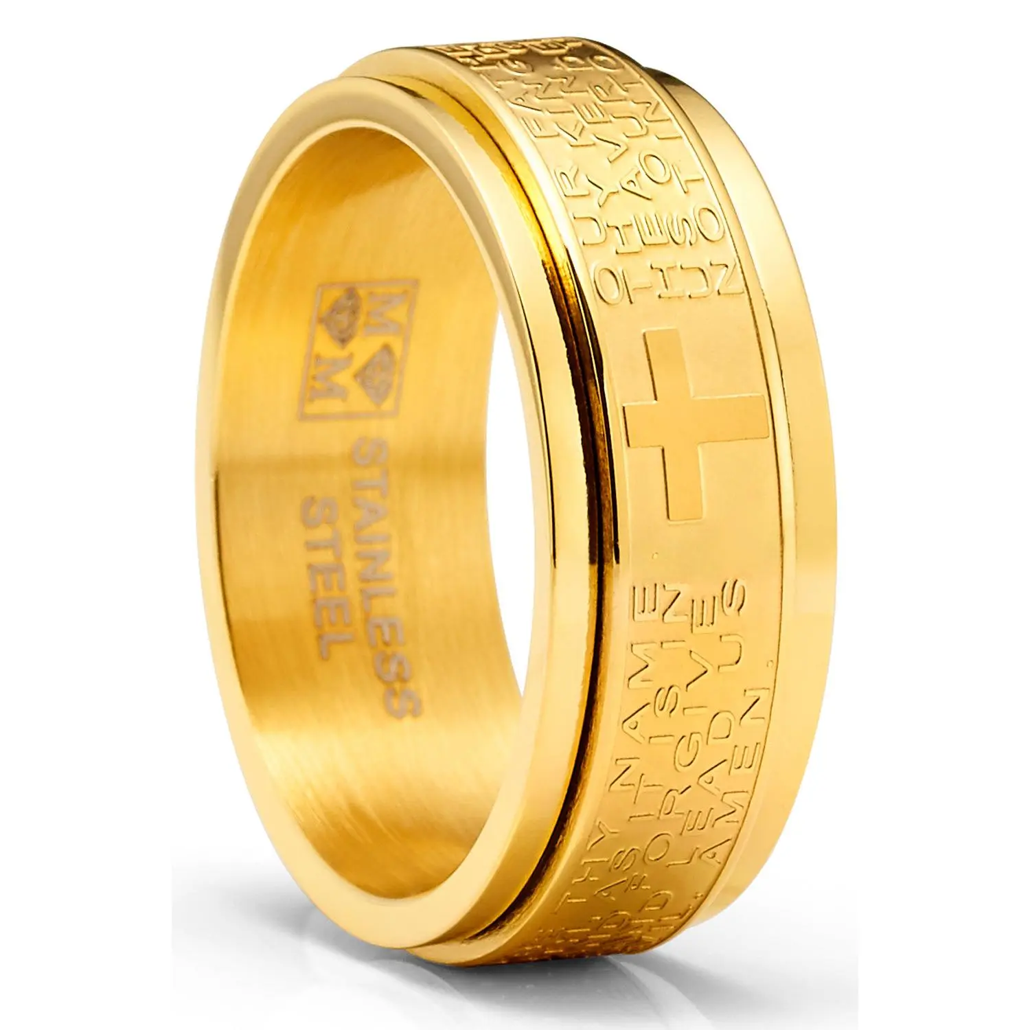 Help ease anxiety and relieve stress with this intricately crafted spinner fidget ring. Finely etched around is Matthew's 6 9-13 Lord's Prayer in raised letters, this solid Stainless Steel ring features a satin brushed center with high polish edges and a Comfort-fit band. Fidget spinner rings can help a busy brain focus & help relieve anxiety, stress and serve as a distraction in an overstimulating environment.