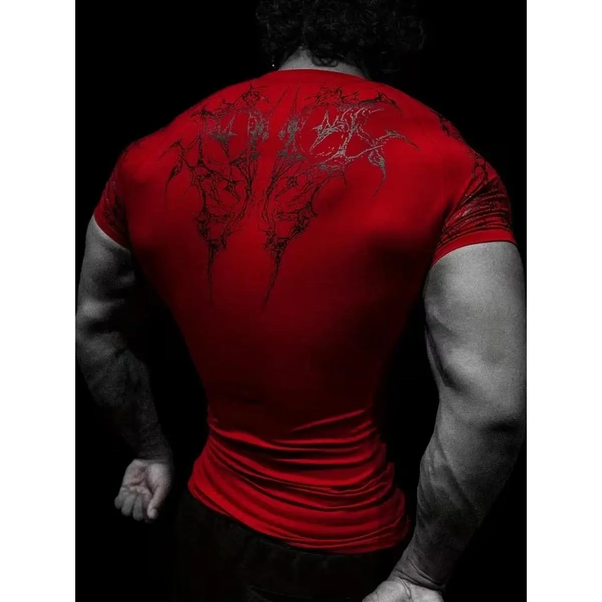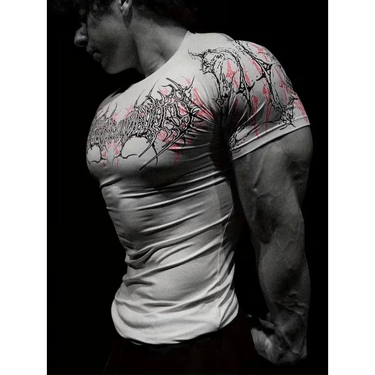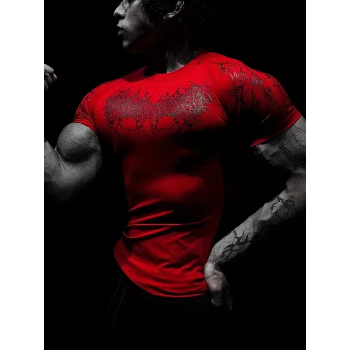 New Men's Trendy Fitted Sports Shirt, Gothic Print Quick-Dry Compression Fitness Top, Short Sleeve Long Clothing, Sporty Geometric Pattern#MustHave #NewArrival #FitnessFashionDrop #StyleUpgrade #WearableArt #BoldStyle #OOTDFashion #GothGym