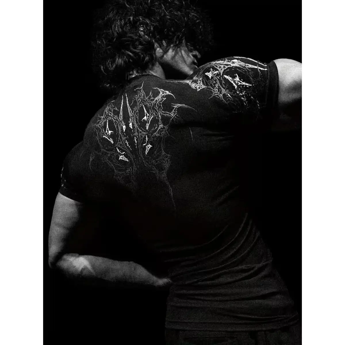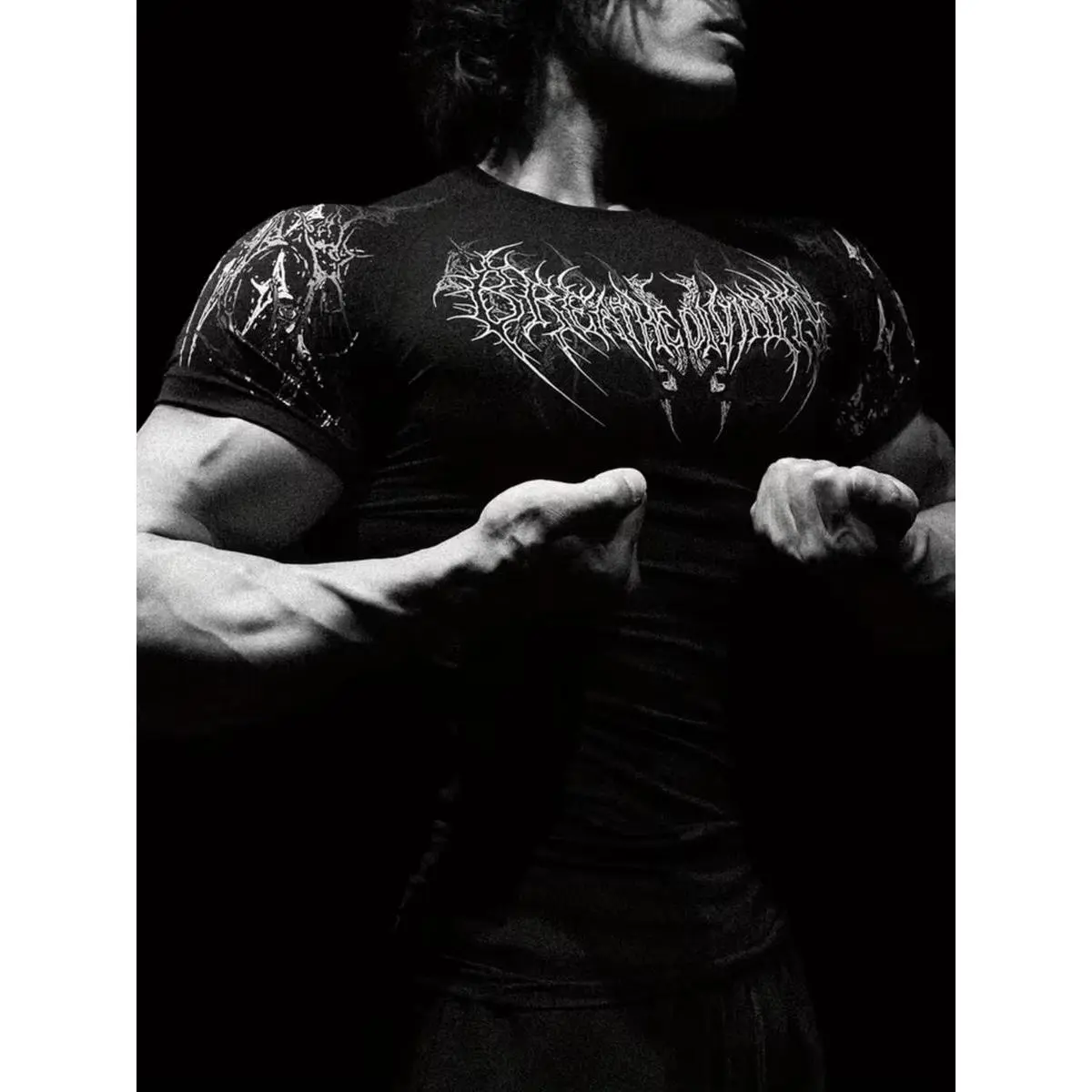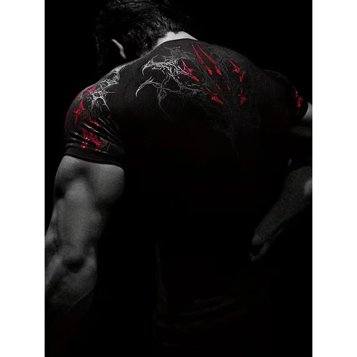 New Men's Trendy Fitted Sports Shirt, Gothic Print Quick-Dry Compression Fitness Top, Short Sleeve Long Clothing, Sporty Geometric Pattern#MustHave #NewArrival #FitnessFashionDrop #StyleUpgrade #WearableArt #BoldStyle #OOTDFashion #GothGym