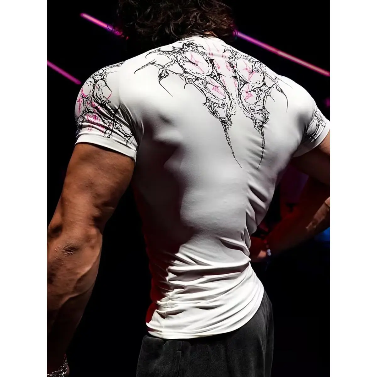 5. New Men's Trendy Fitted Sports Shirt, Gothic Print Quick-Dry Compression Fitness Top, Short Sleeve Long Clothing, Sporty Geometric Pattern