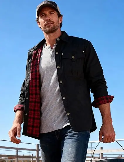 This men's jacket combines rugged charm with effortless style. It's perfect for outdoor adventures and casual work. The vintage flannel lining and metal snap buttons add a cowboy cool vibe. The classic turndown collar is sleek and stylish. Hidden plaid flannel inside the cuffs reveals the pattern when rolled up, adding a nice detail.