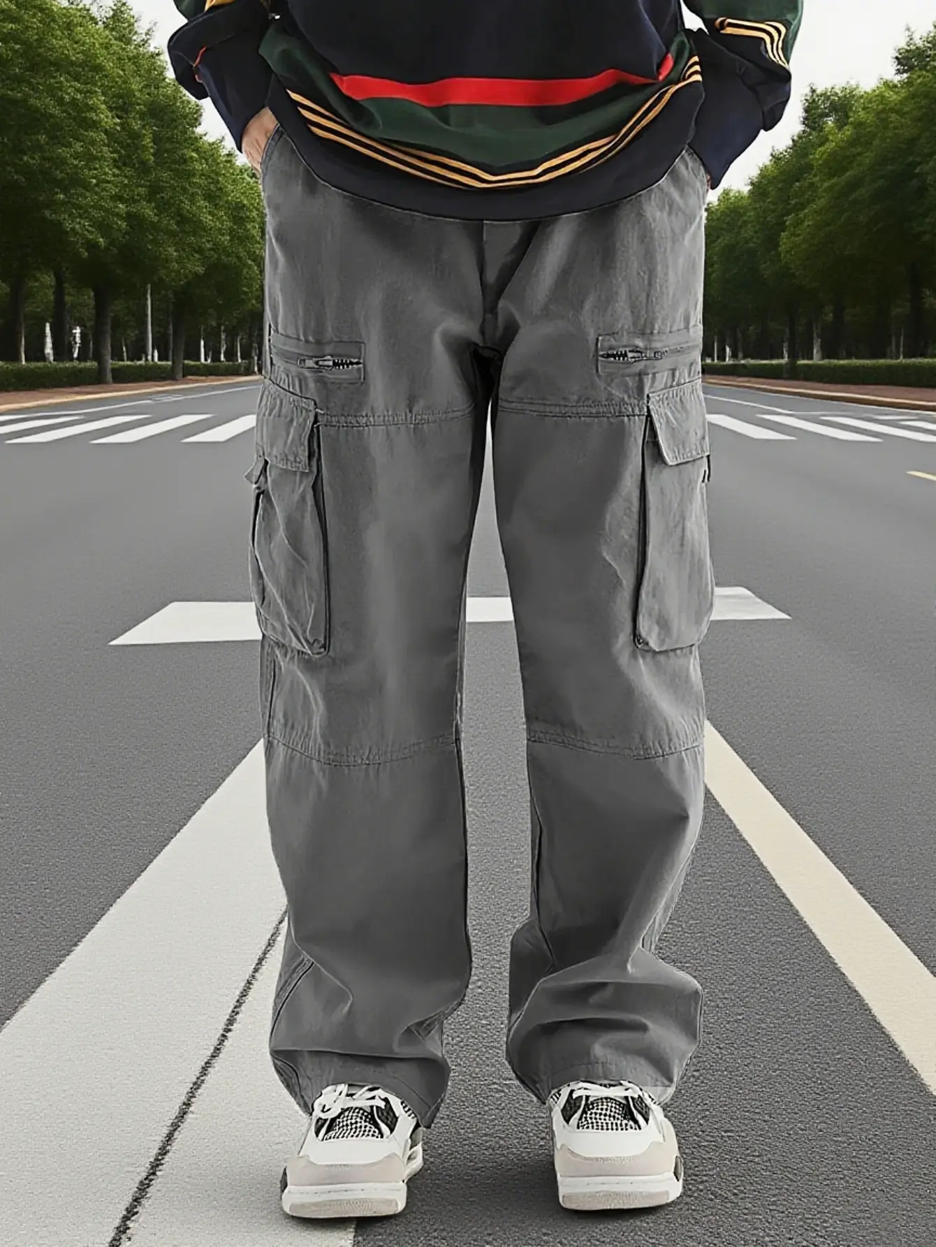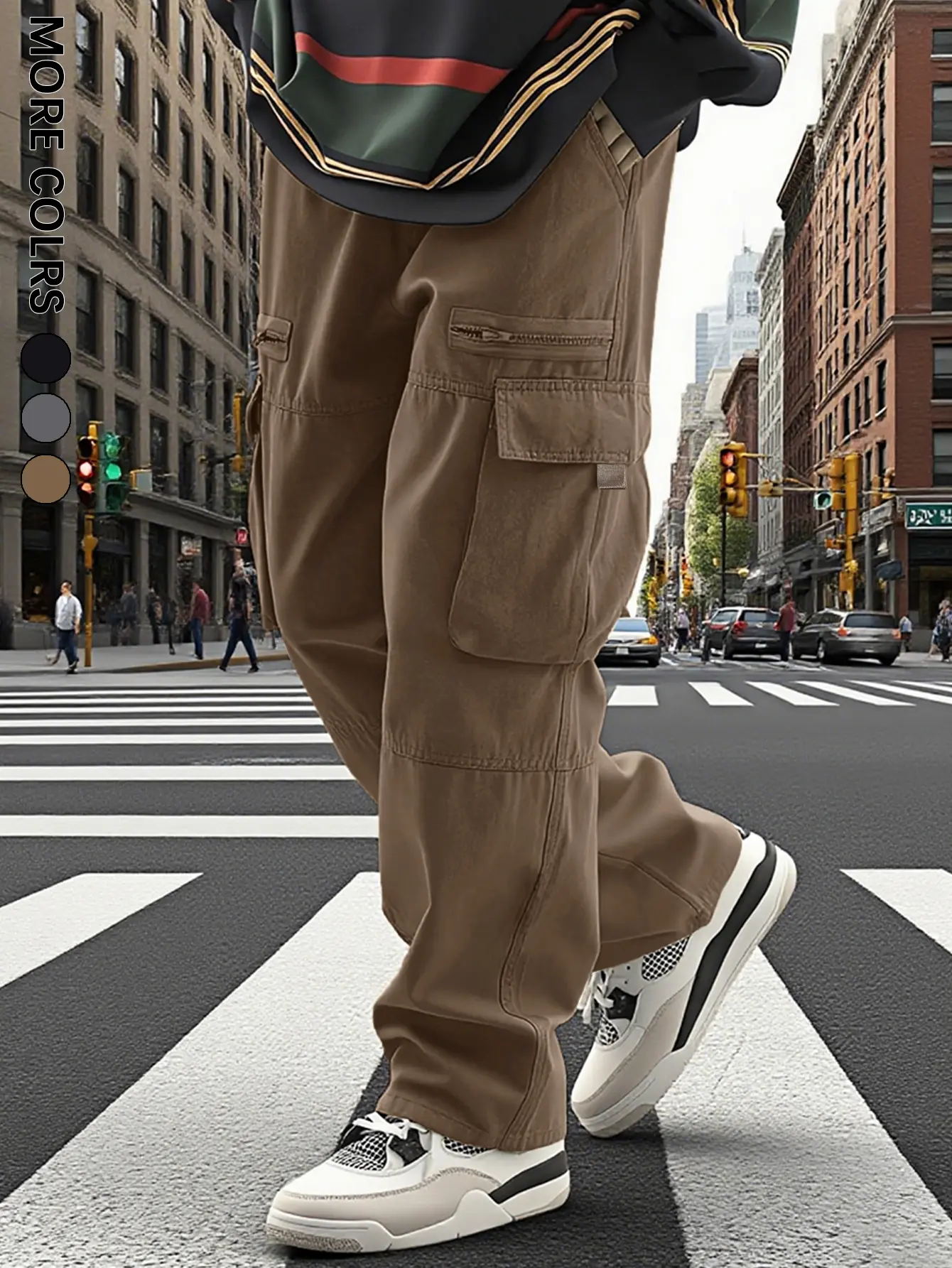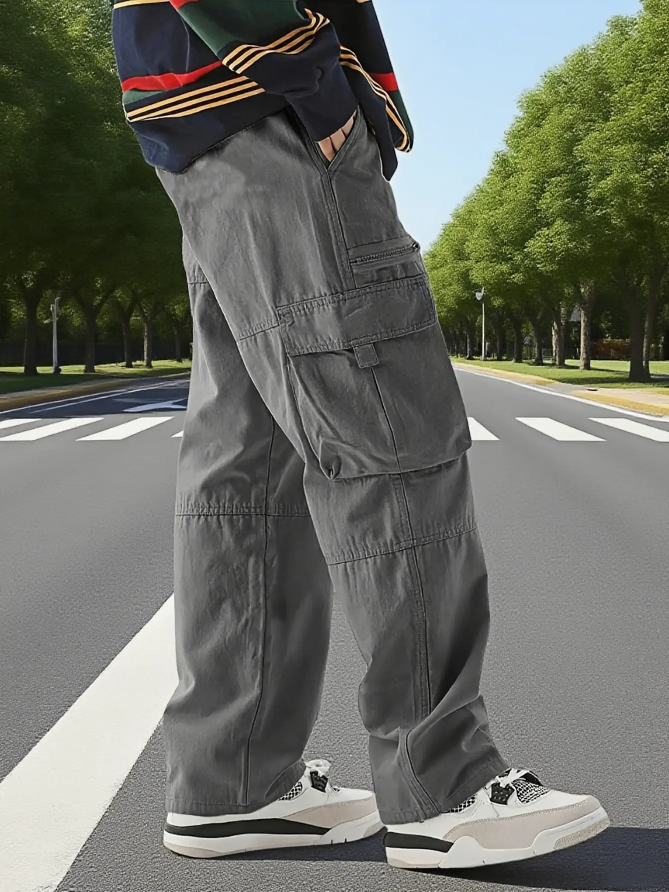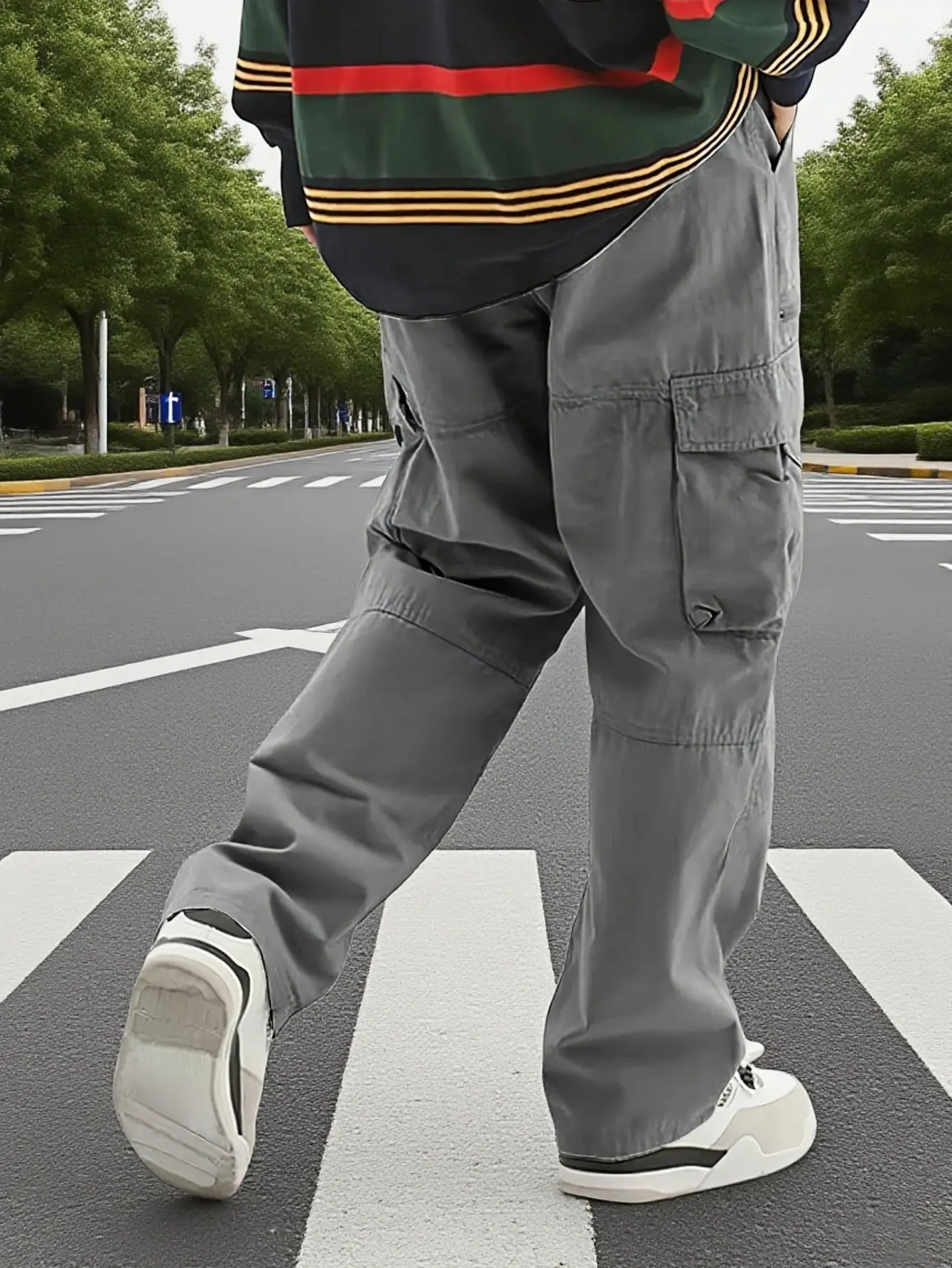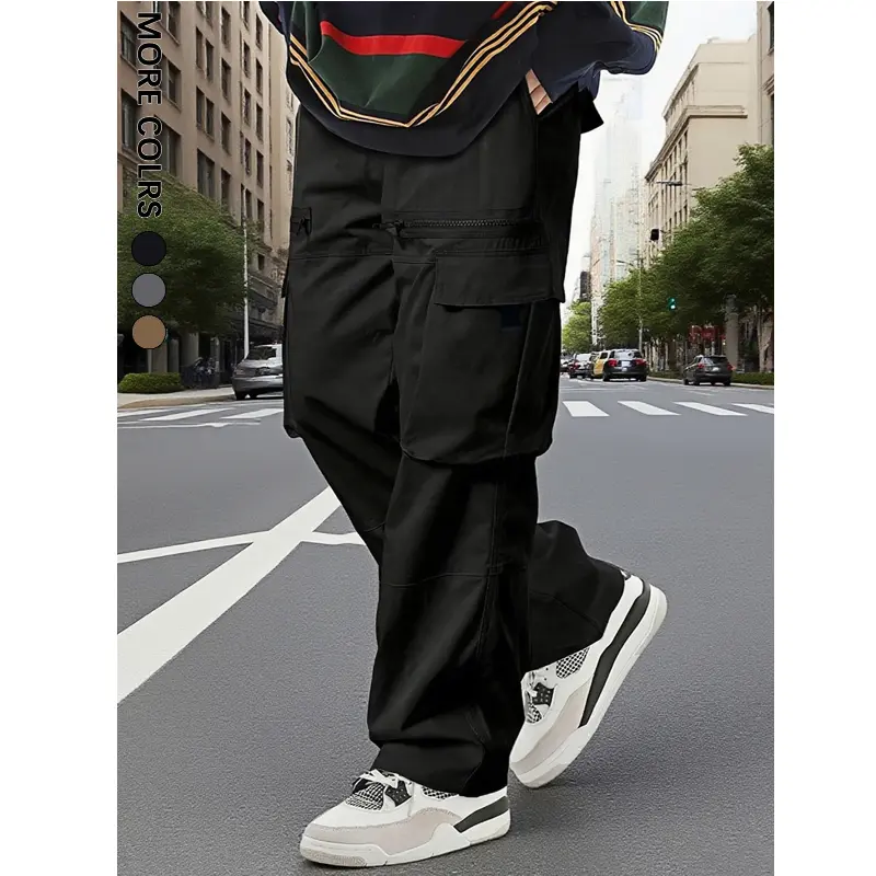 These men's cargo pants feature a loose fit, ideal for all seasons. They are designed for street fashion, making them a versatile addition to your wardrobe. The pants include flap pockets, adding both style and functionality. Perfect for casual outings, they embody the essence of streetstyle clothing. Stay comfortable and stylish with these men's bottoms.